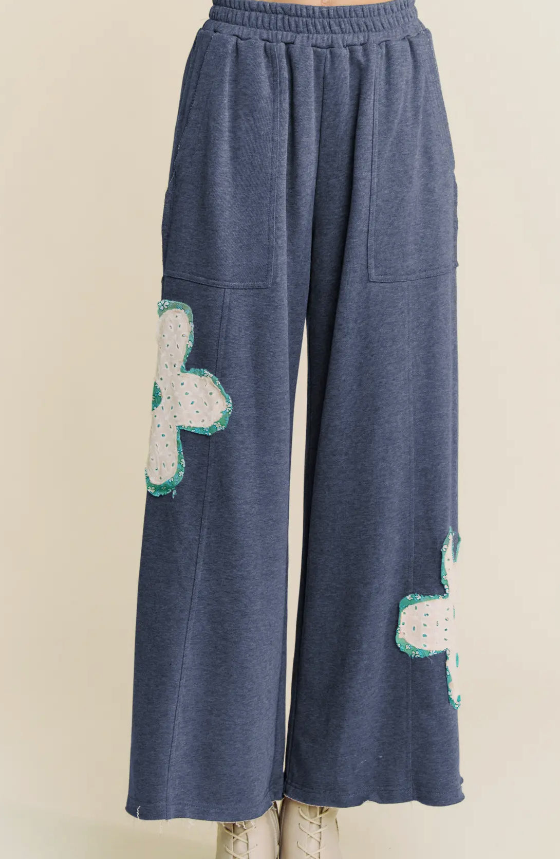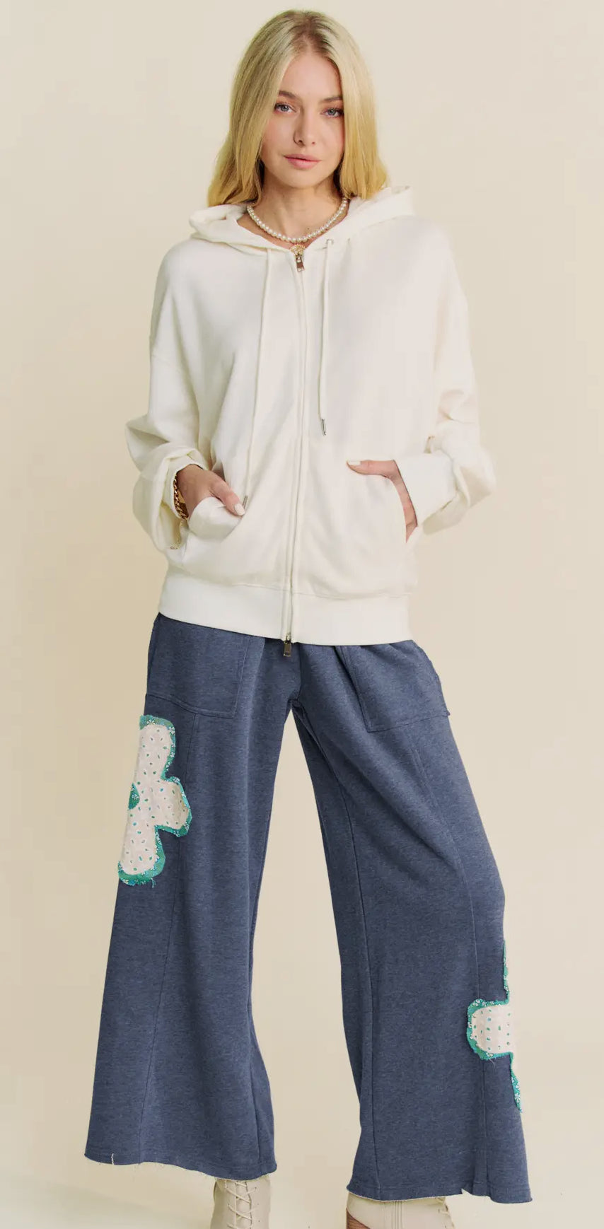 Elastic French terry pants in denim blue that features flower patches. A high quality brand that we love, Davi and Dani!