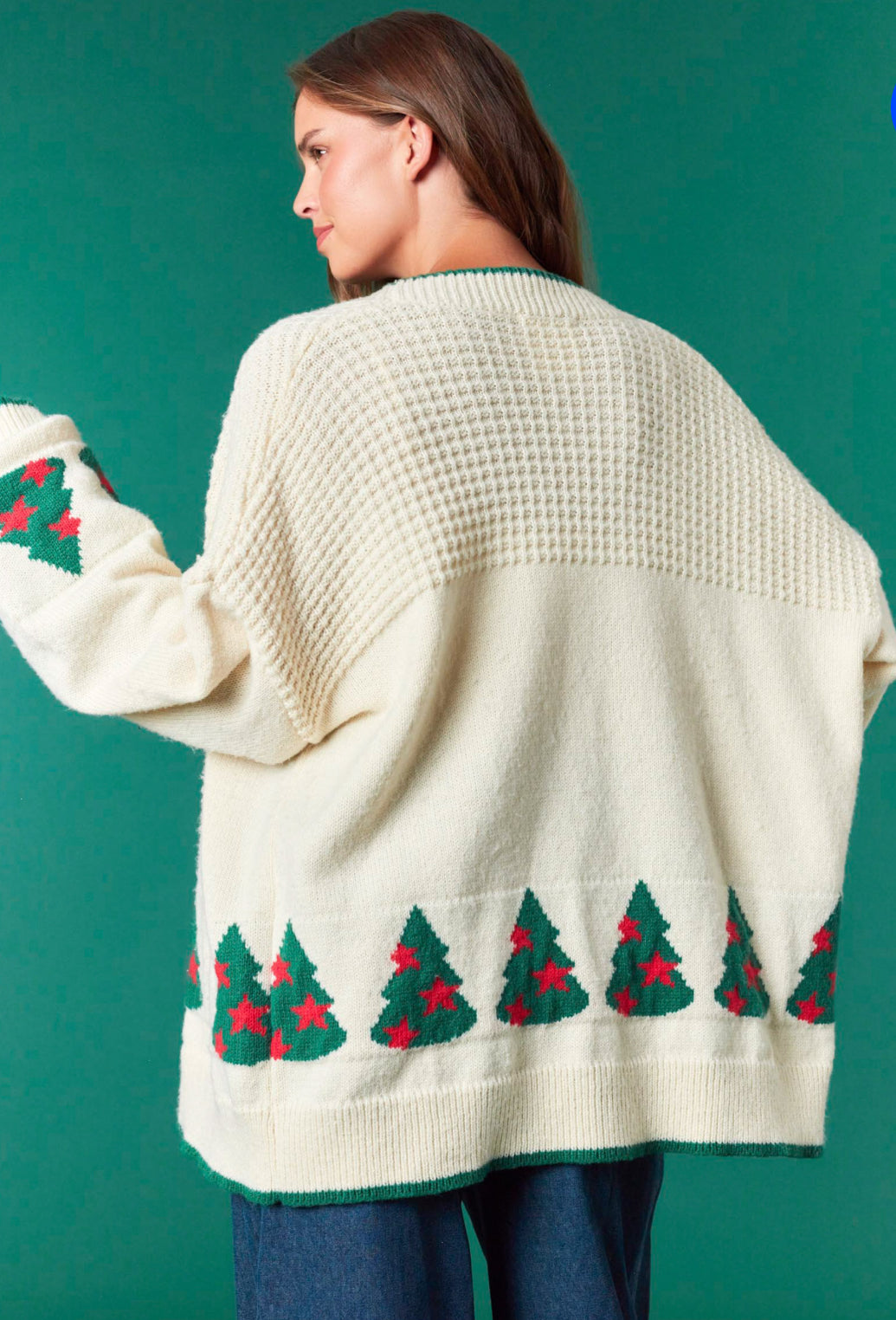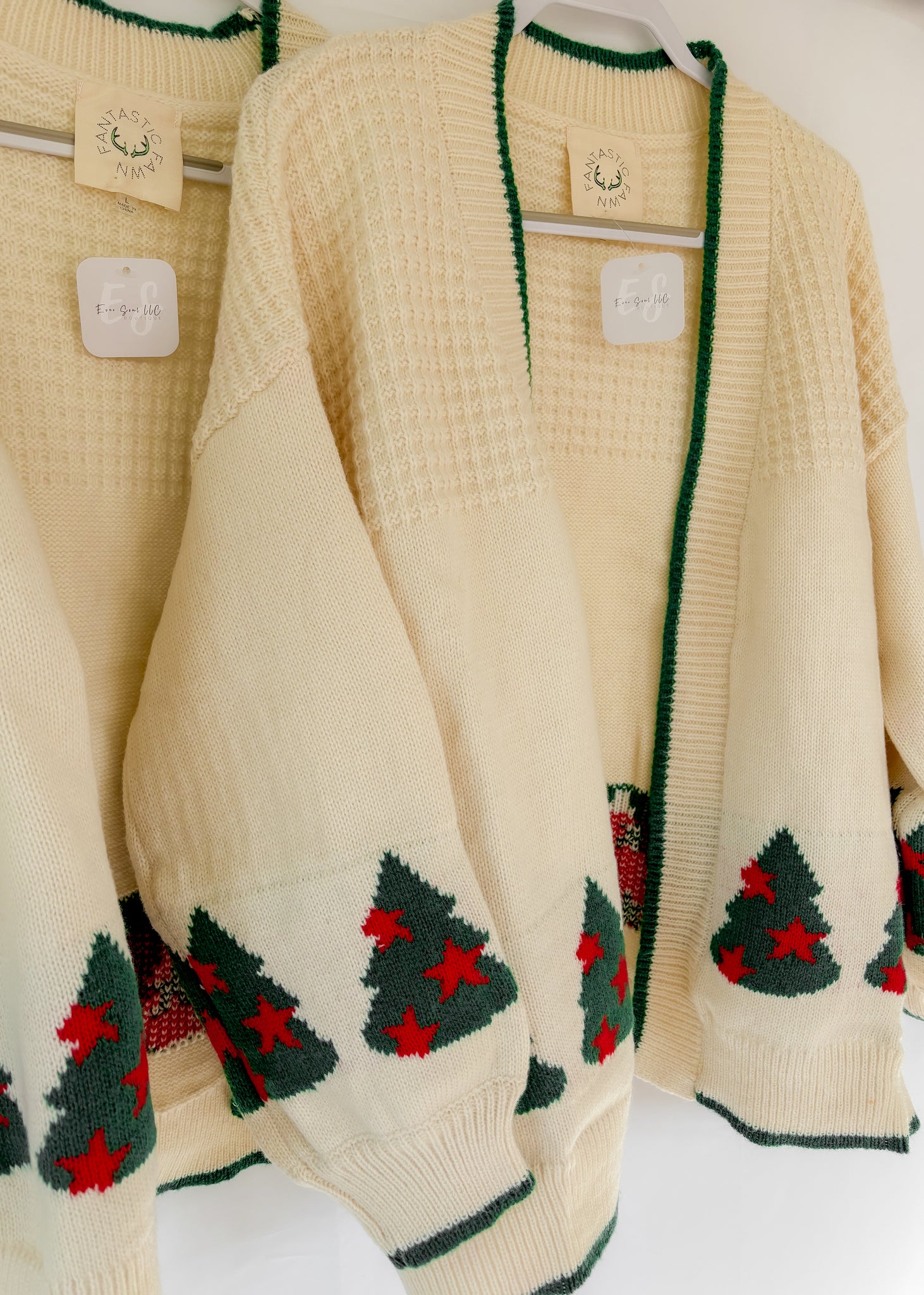 Christmas Tree with stars sweater cardigan in ivory and green. 100% Polyester.