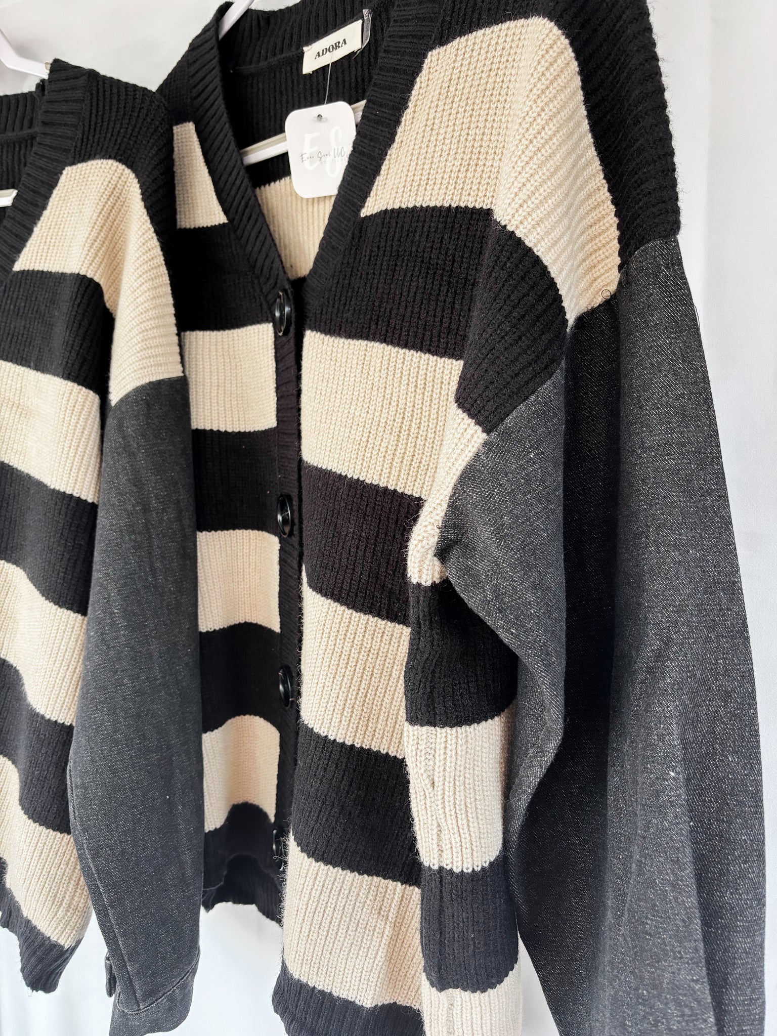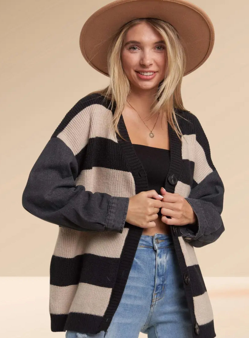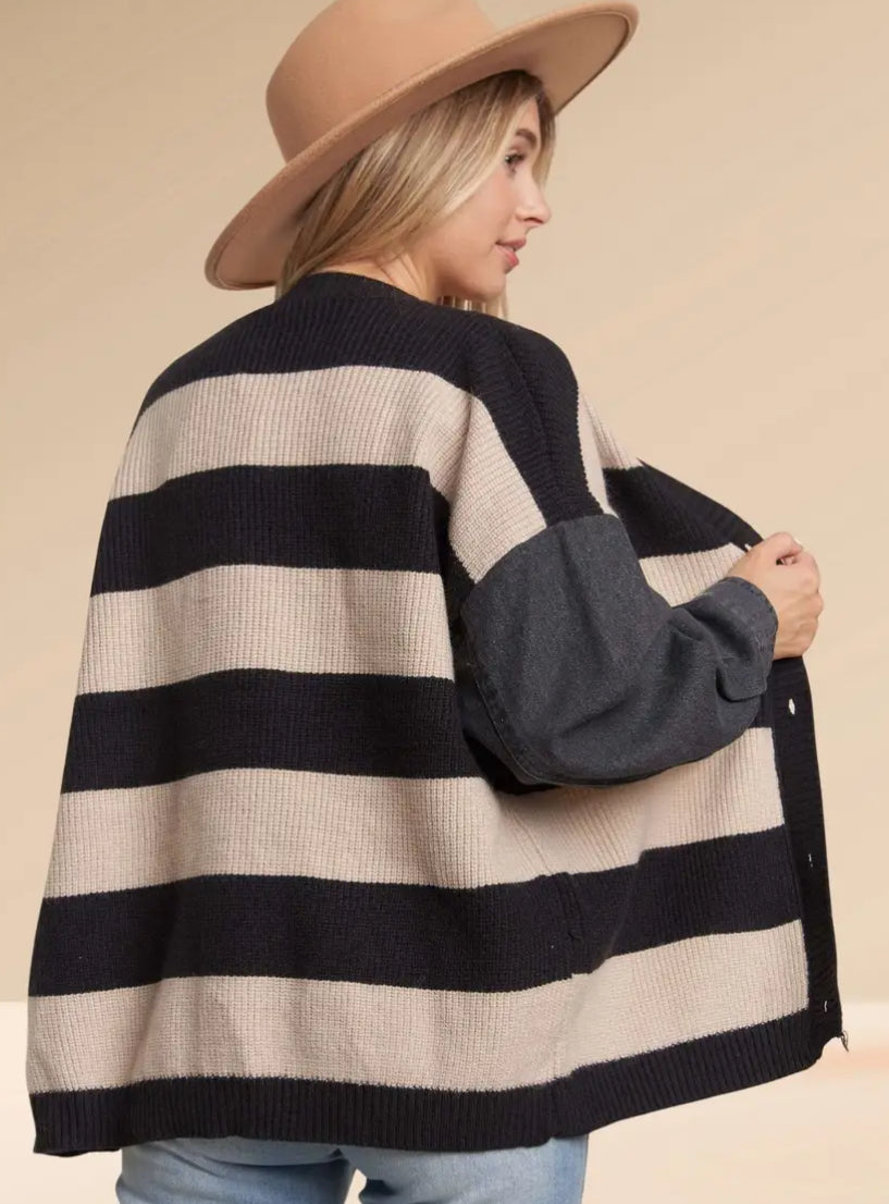 Denim sleeve button down striped sweater cardigan in black and beige colors. 50% Nylon, 30% Spandex, 20% Polyester.