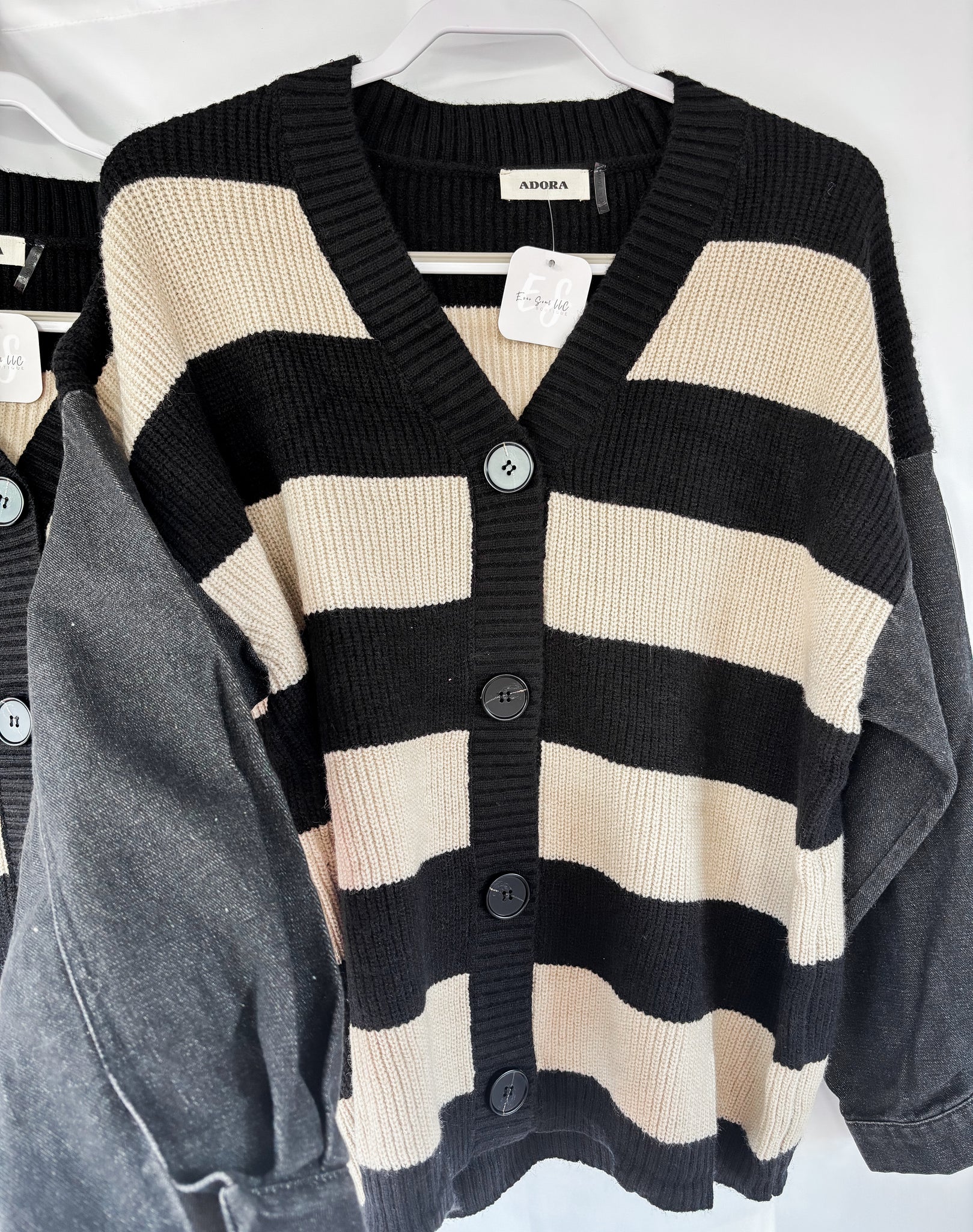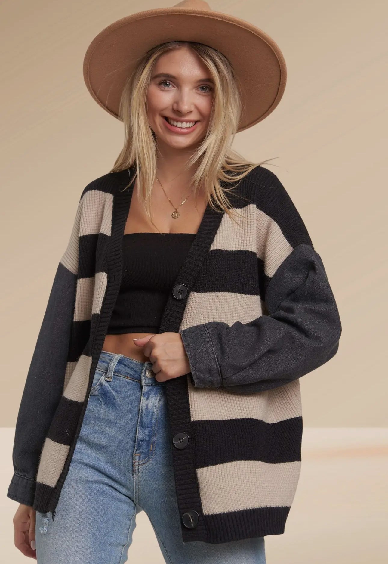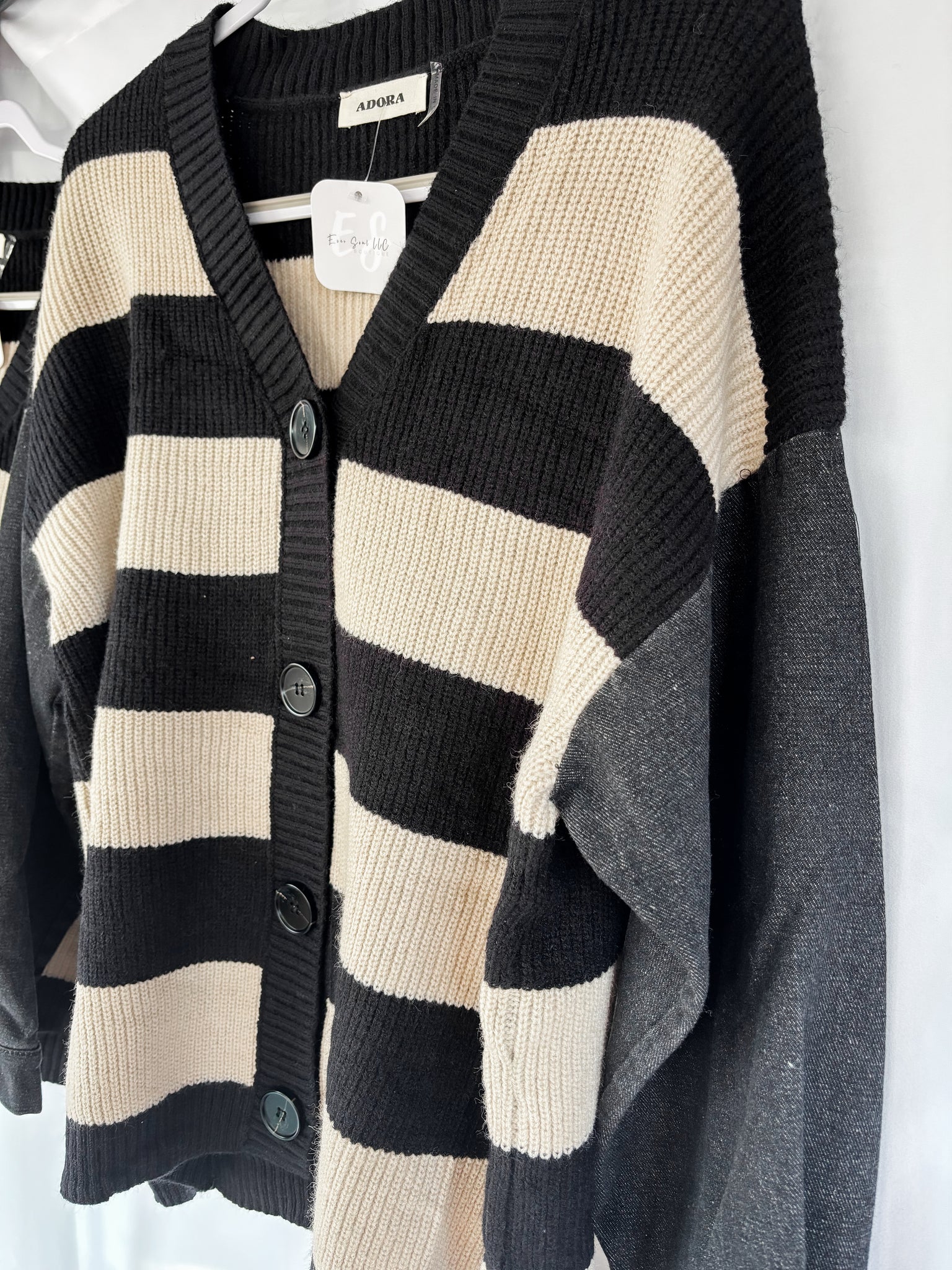 Denim sleeve button down striped sweater cardigan in black and beige colors. 50% Nylon, 30% Spandex, 20% Polyester.