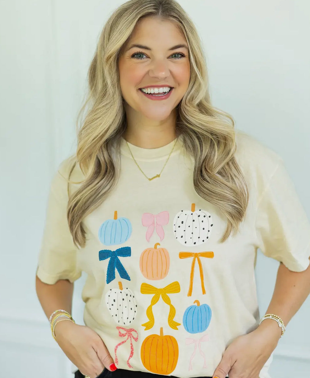 Ivory color tee that features fall pumpkins and coquette bows. Unisex sizing | Tee is COMFORT COLORS brand. 100% Cotton.
