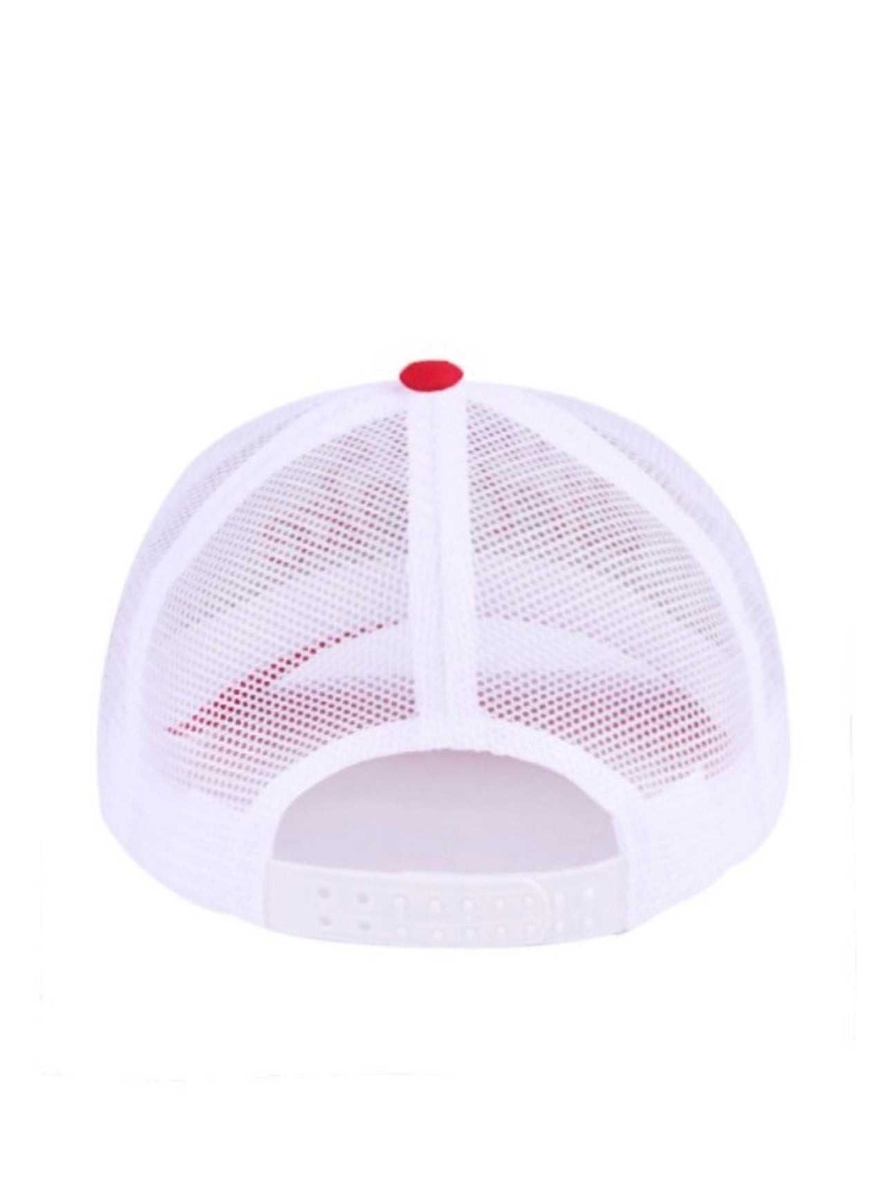Two tone red and white colorblock mesh trucker hat that has adjustable snap-back. One size fits most.