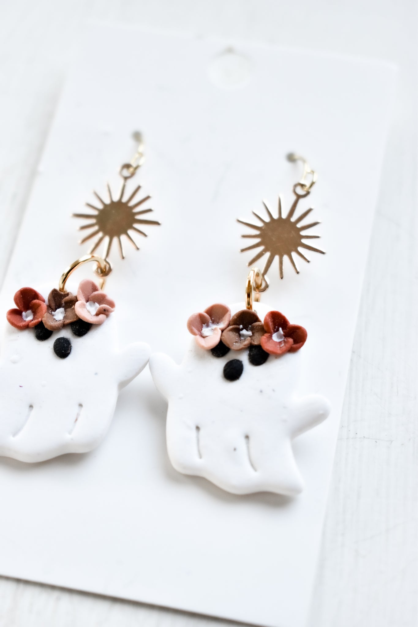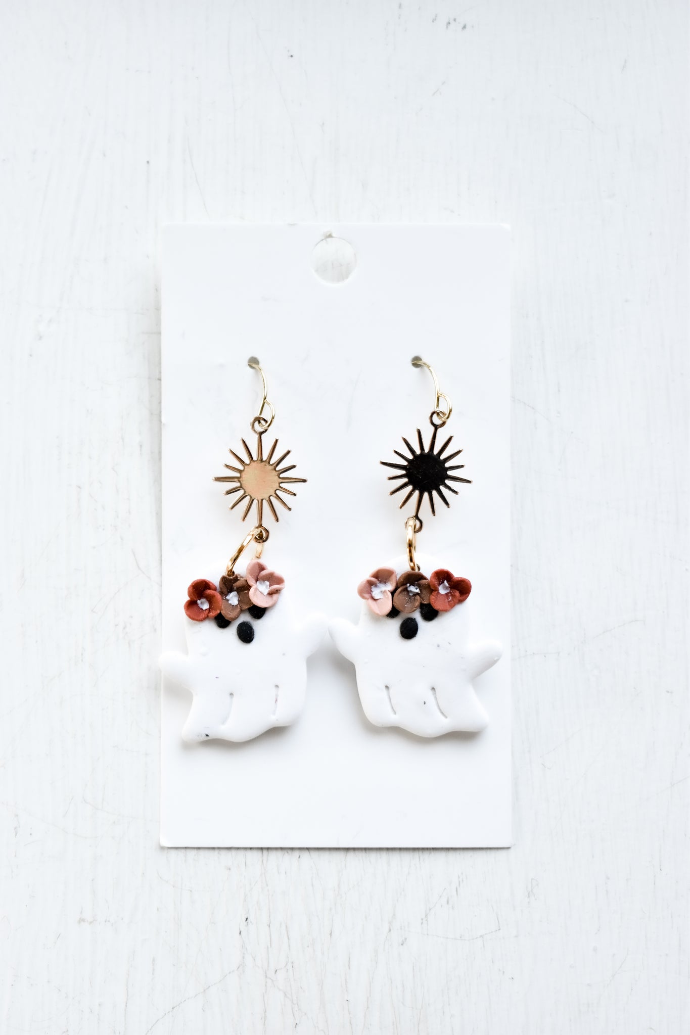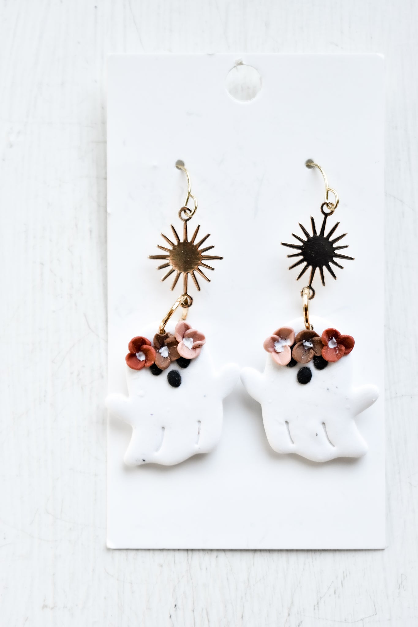 Ghost with floral crown dangle earrings made of polymer clay. Lightweight, hypoallergenic. Handmade by Terra Made shop in Georgia!