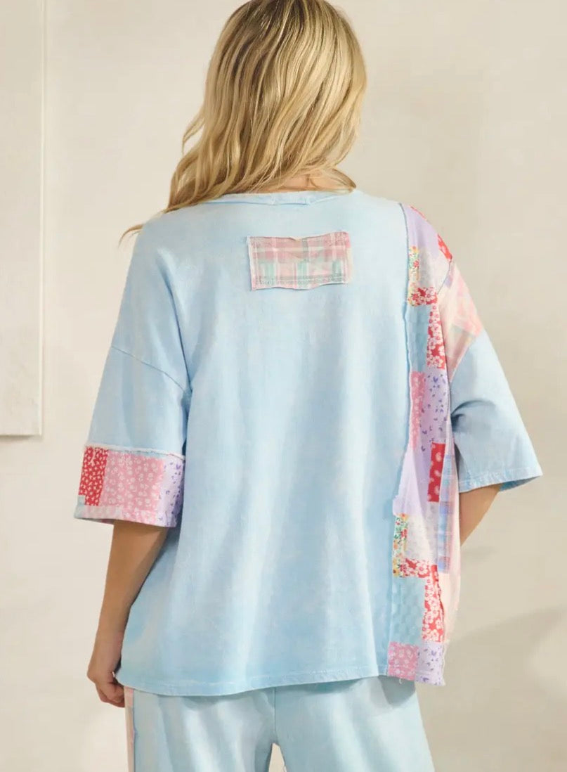Gorgeous mineral washed plaid bandana daisy patched blouse top in baby blue color.