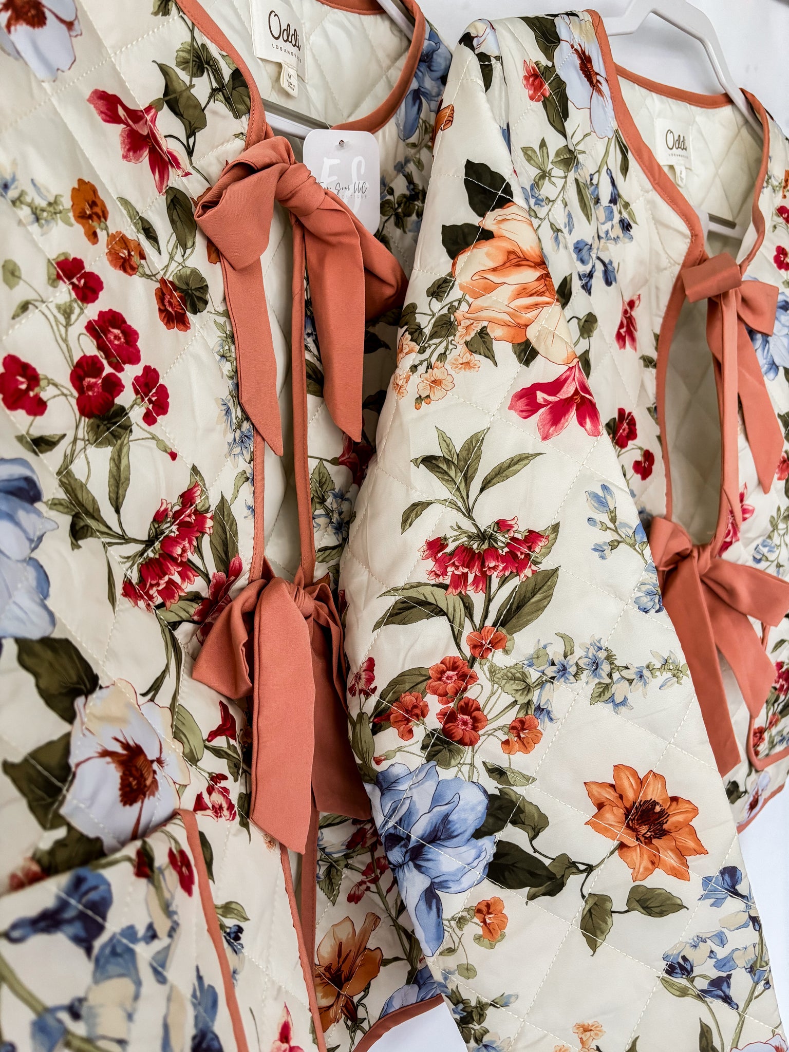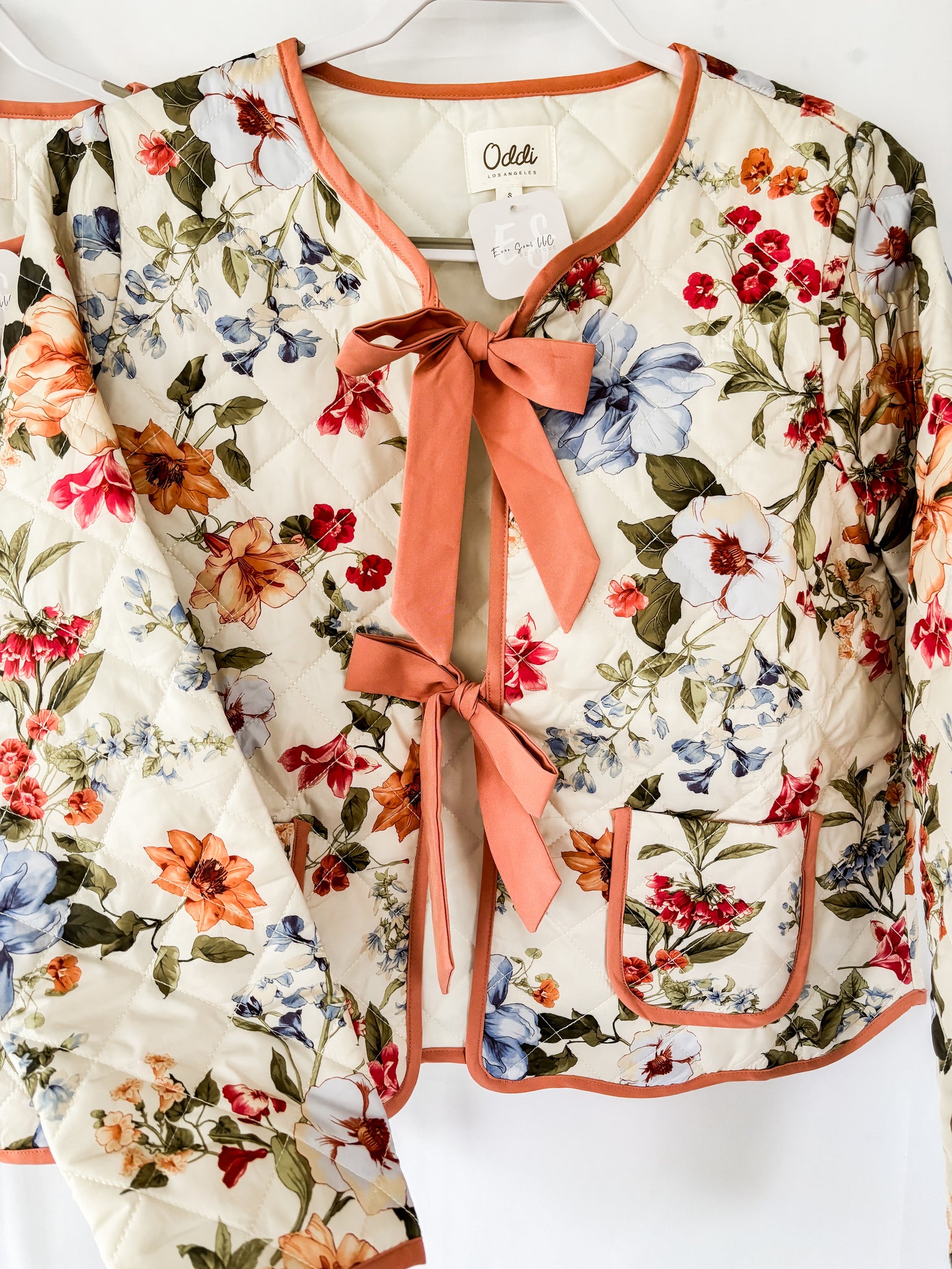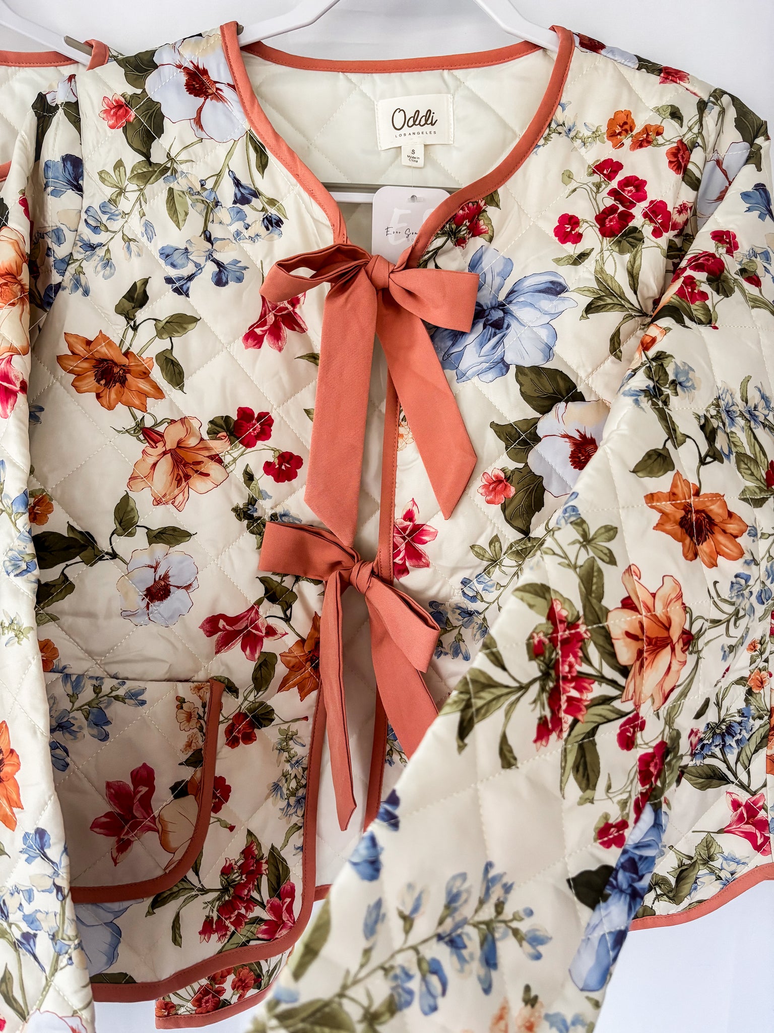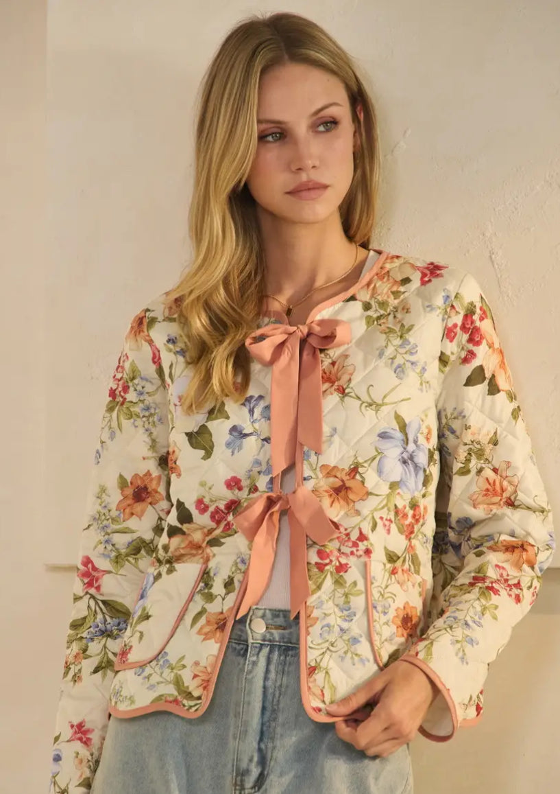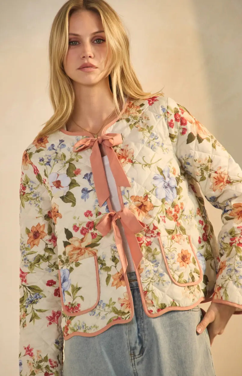 Quilted floral printed jacket with contrast binding and front ribbon tie closures. 100% Polyester. Total length: 22 1/2”