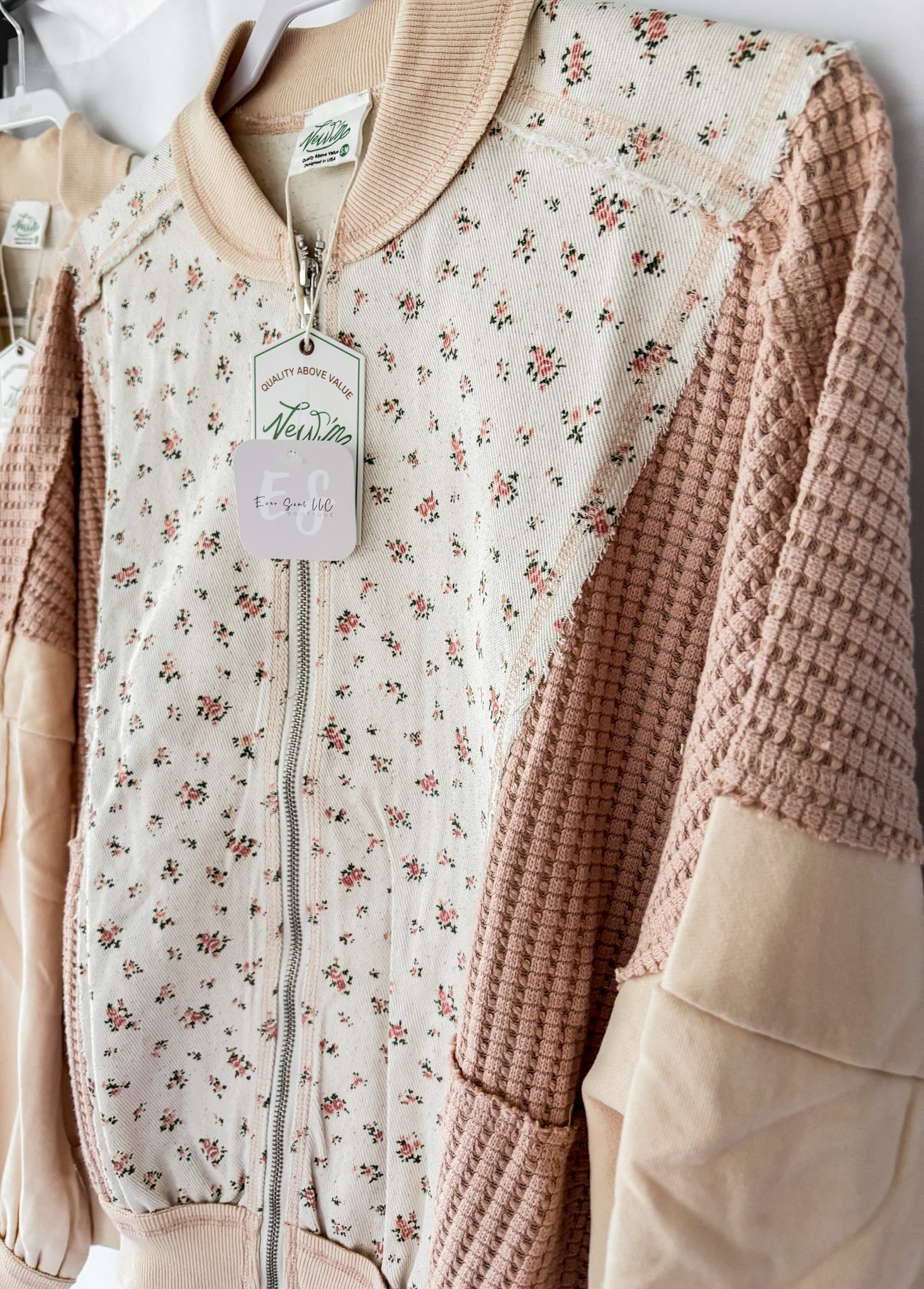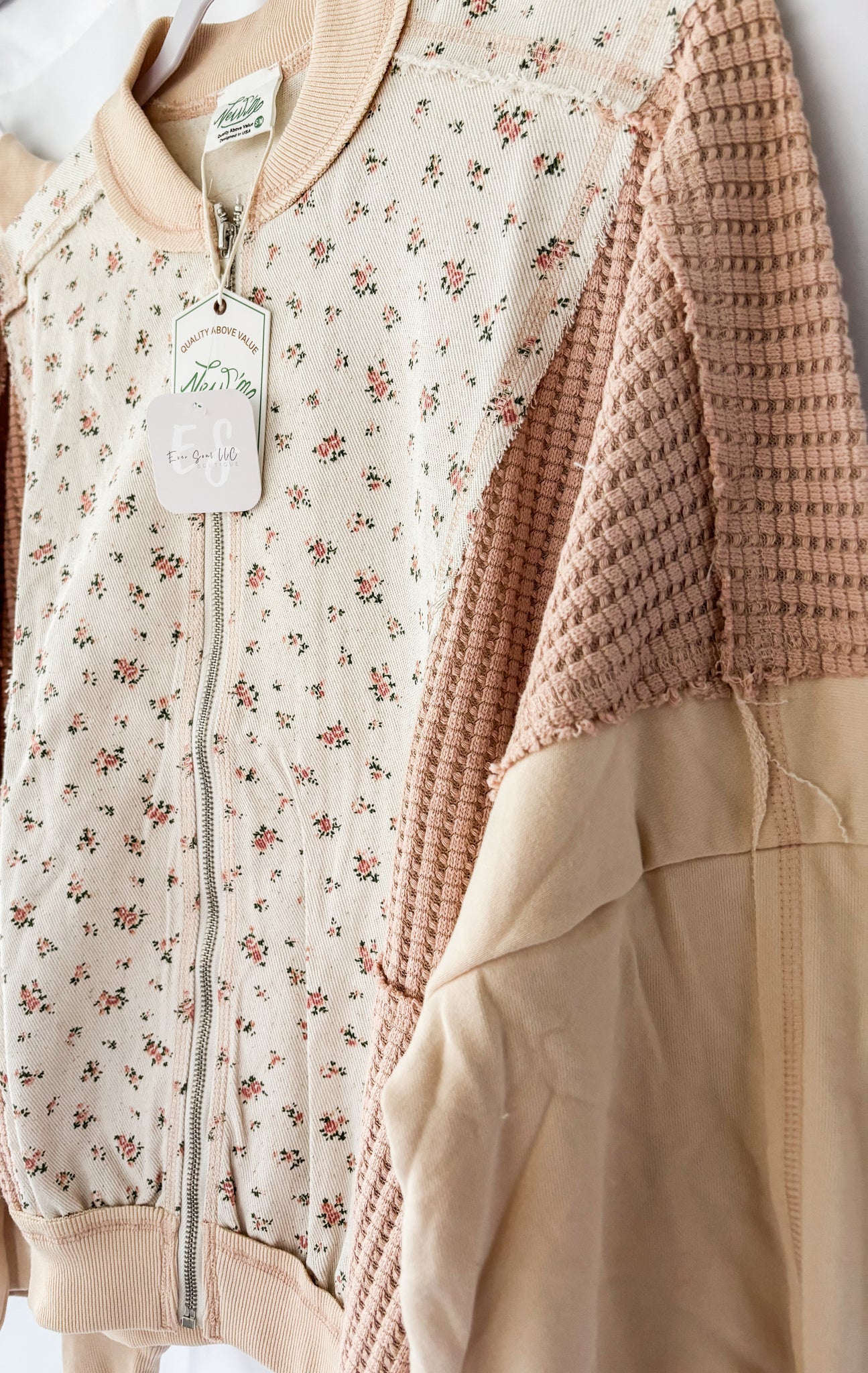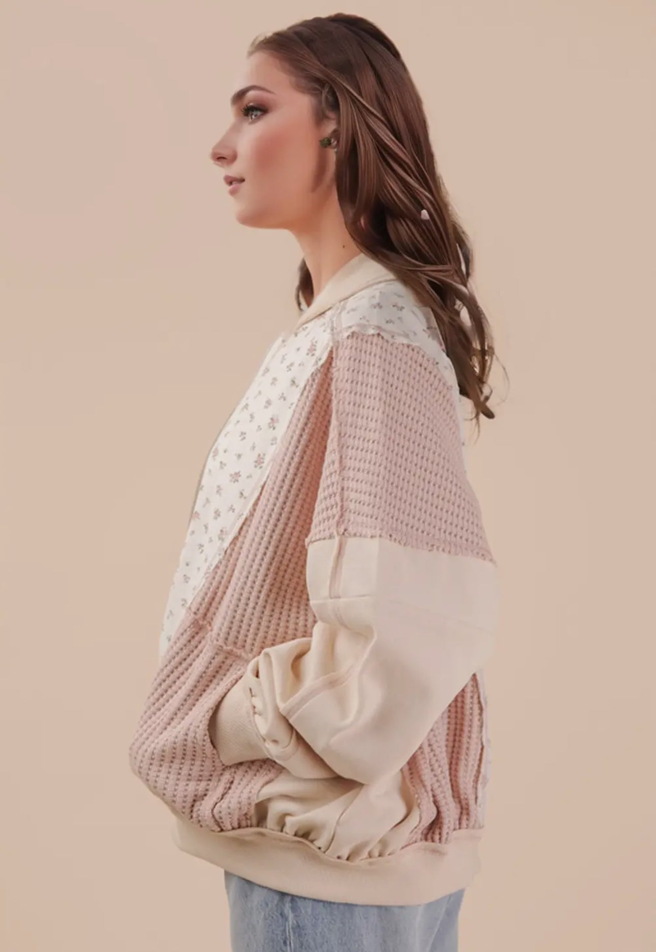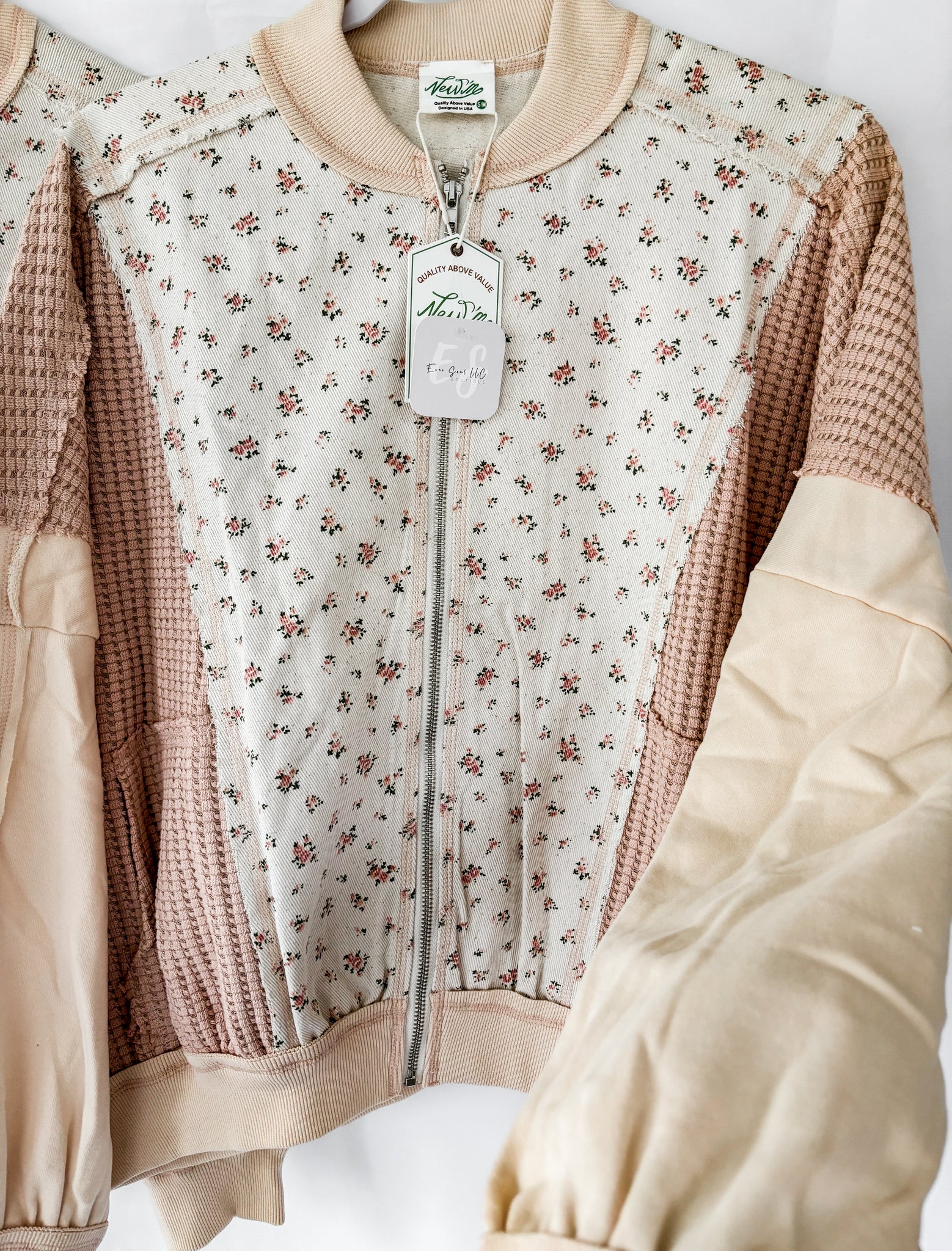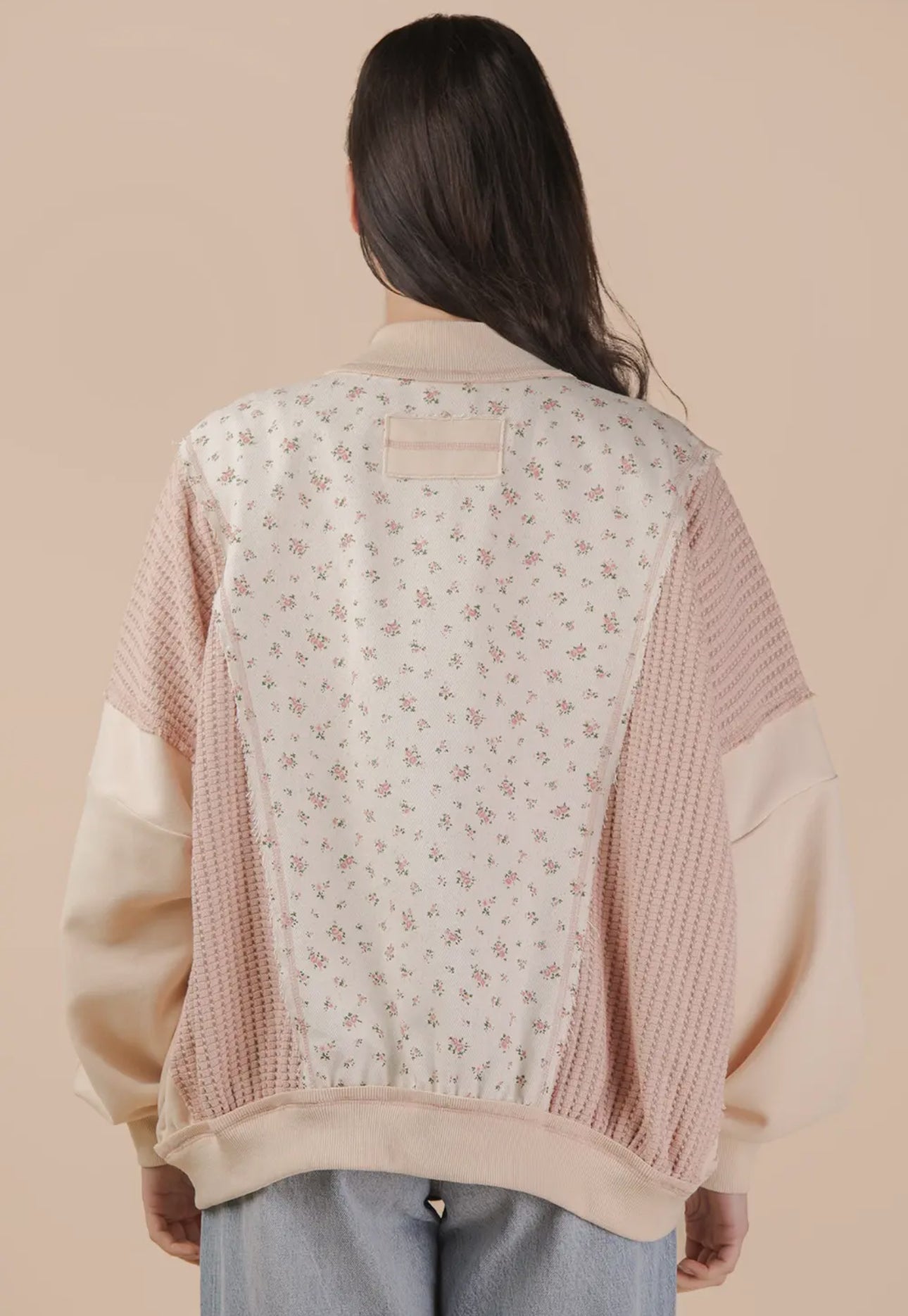 Floral printed contrast knit jacket in oatmeal color that features zip up, side pockets, waffle knit, and long dolman sleeves. 100% Cotton.