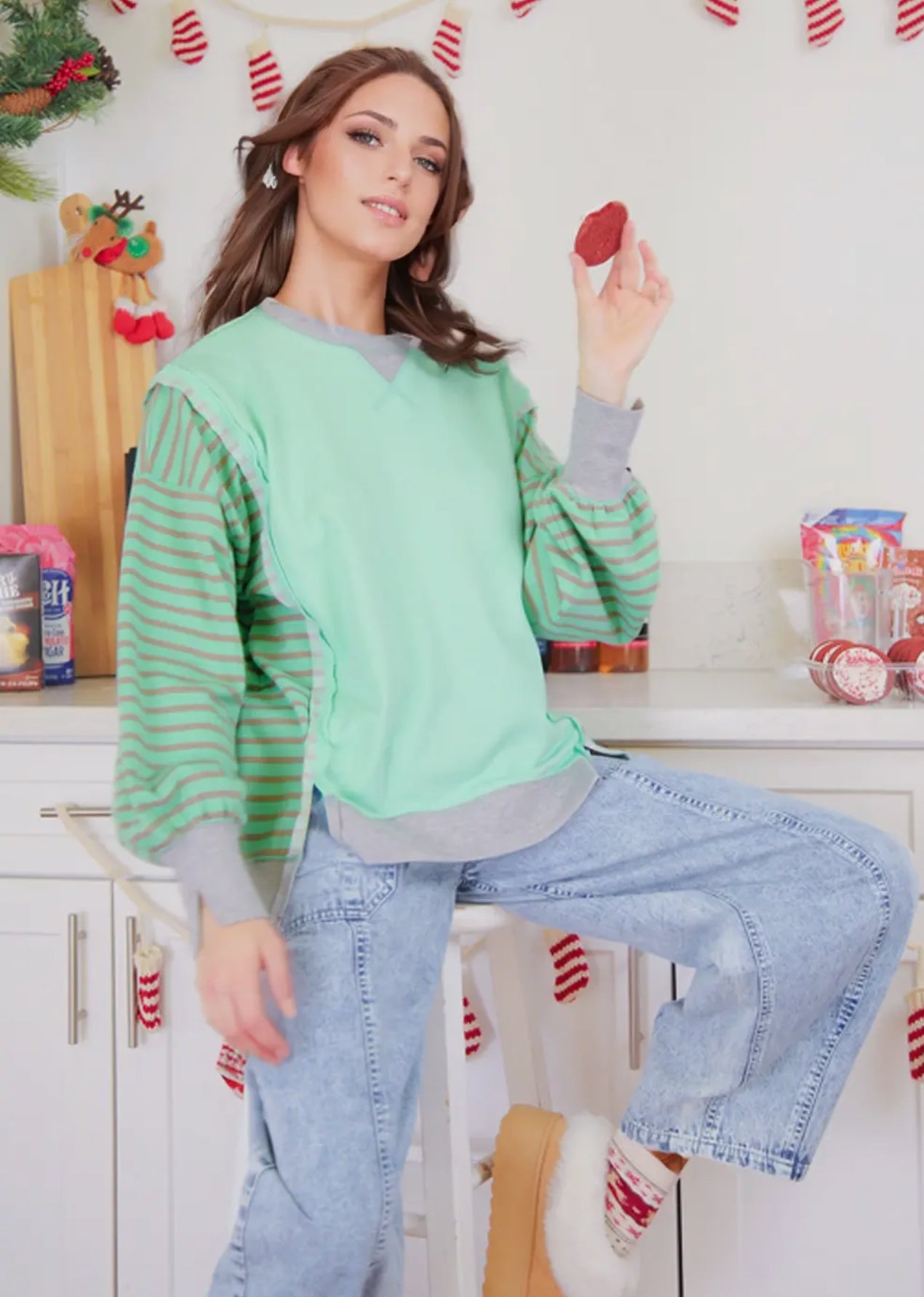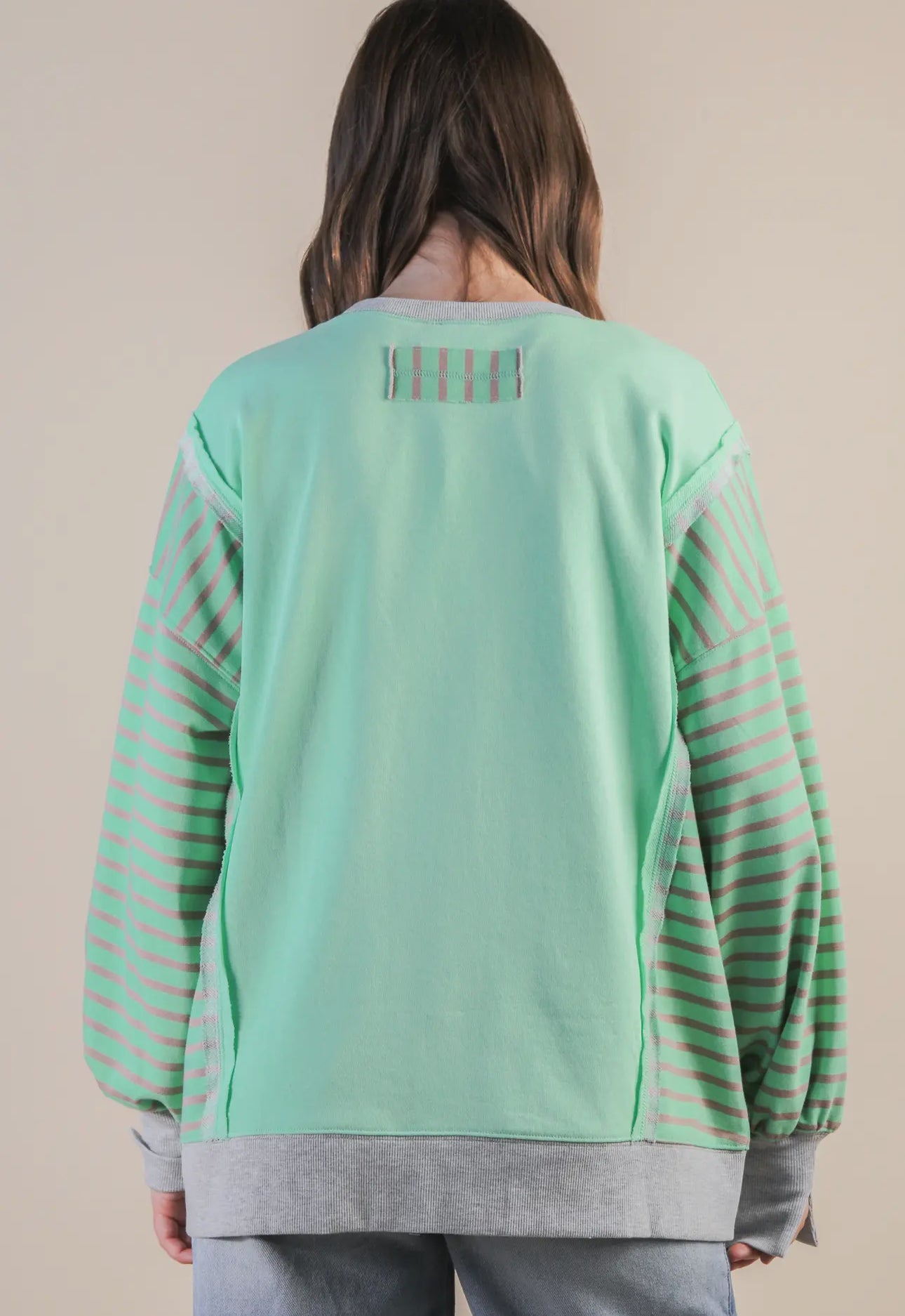 Oversized green and gray striped top that features a round neck, drop shoulder, front slit, sleeve slit, and a hi-low hem.