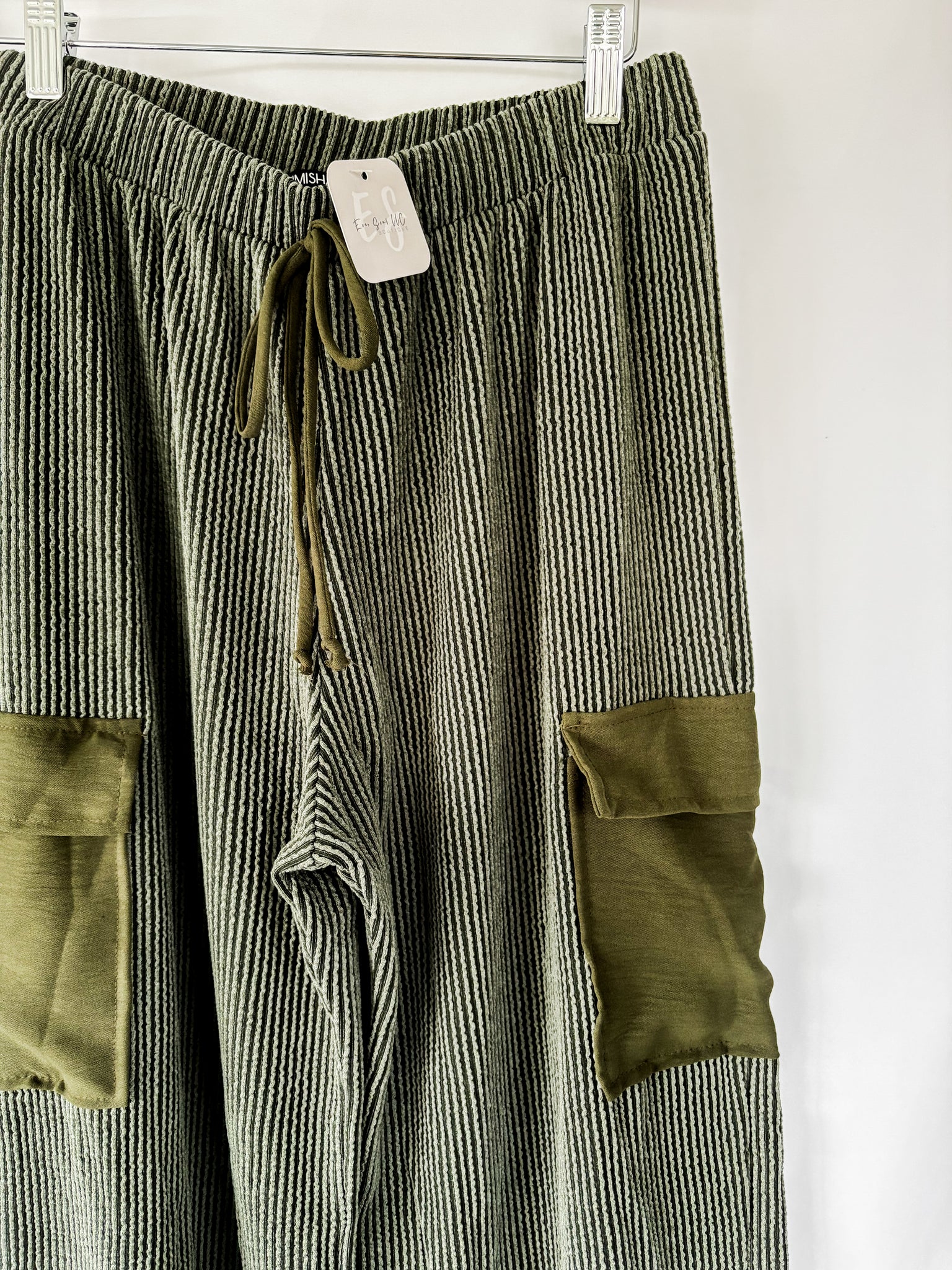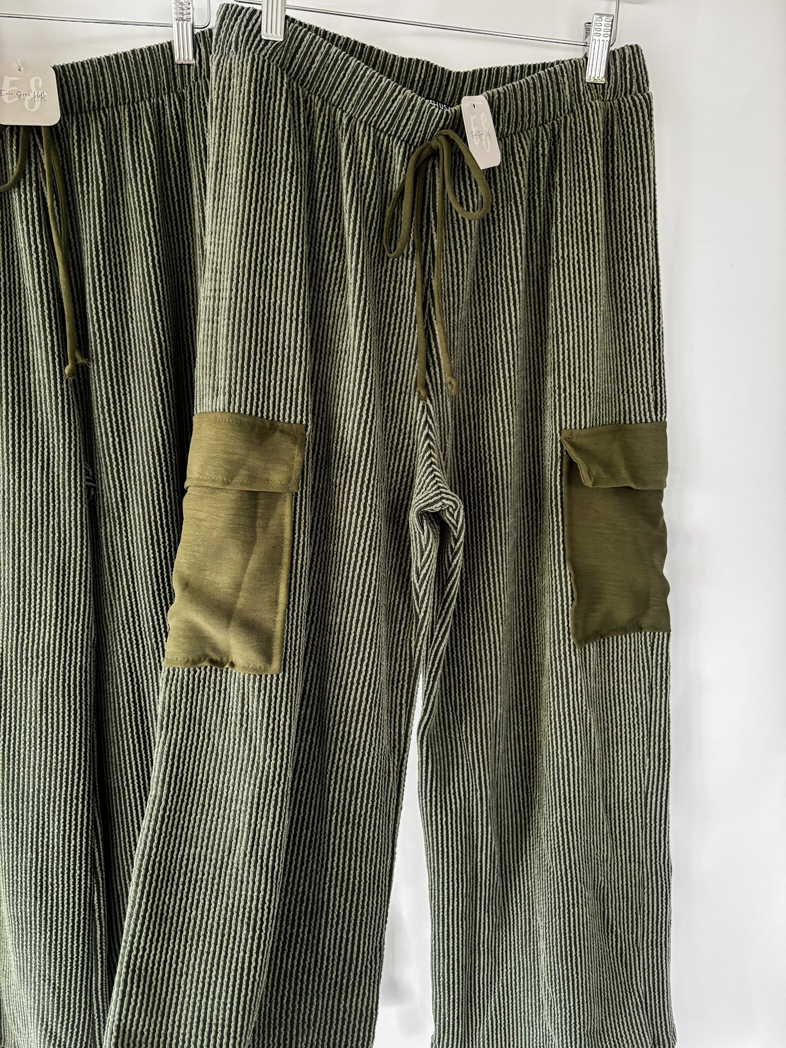 Solid color olive green urban ribbed casual pants that features elastic waistband, side pockets, and draw string detail. 95% Polyester, 5% Spandex.