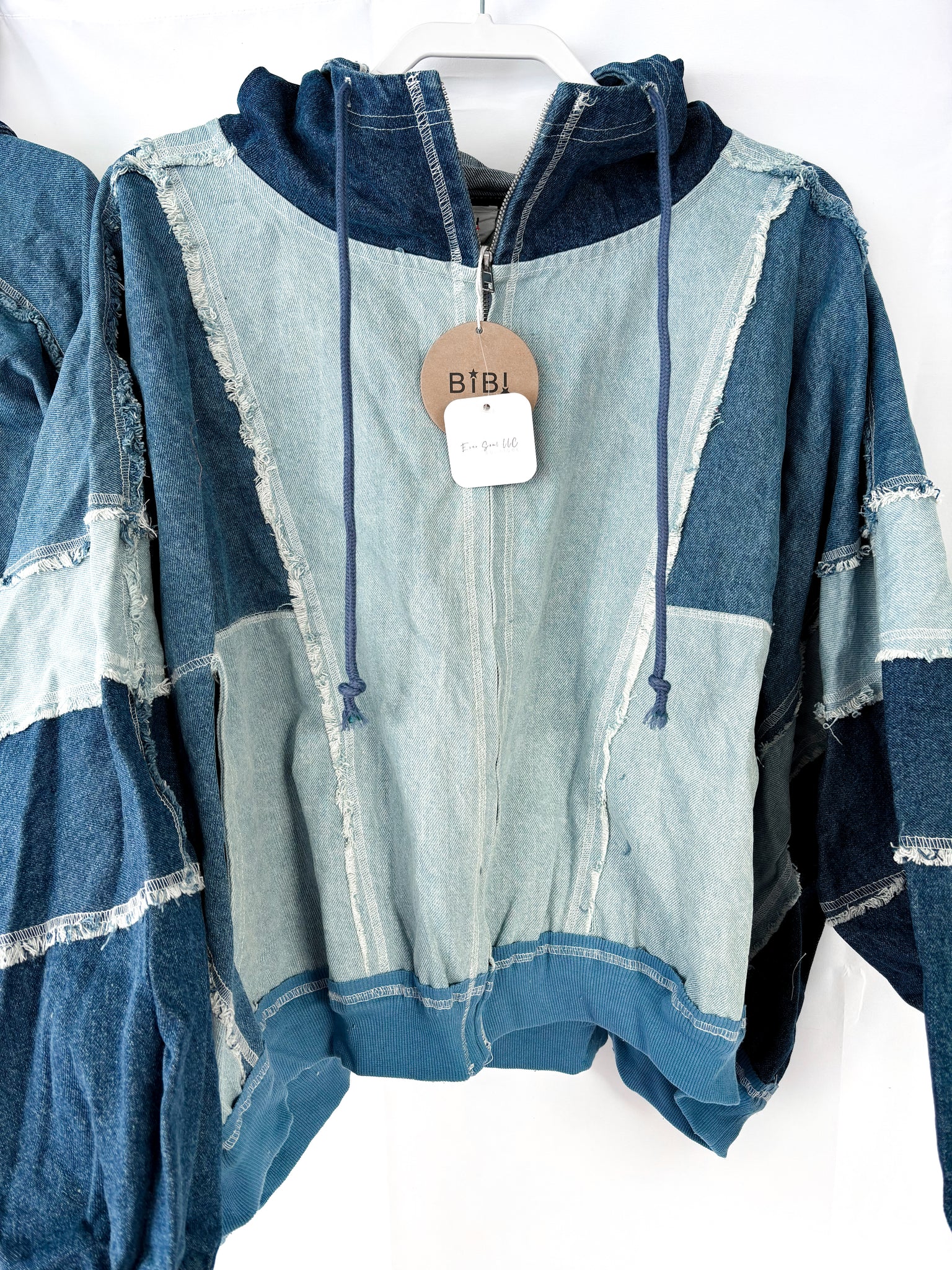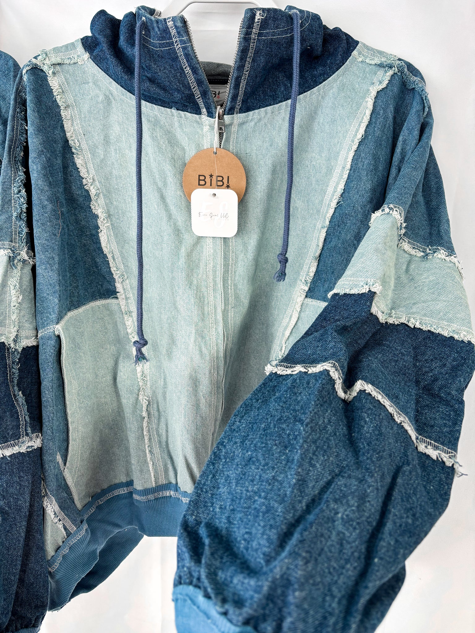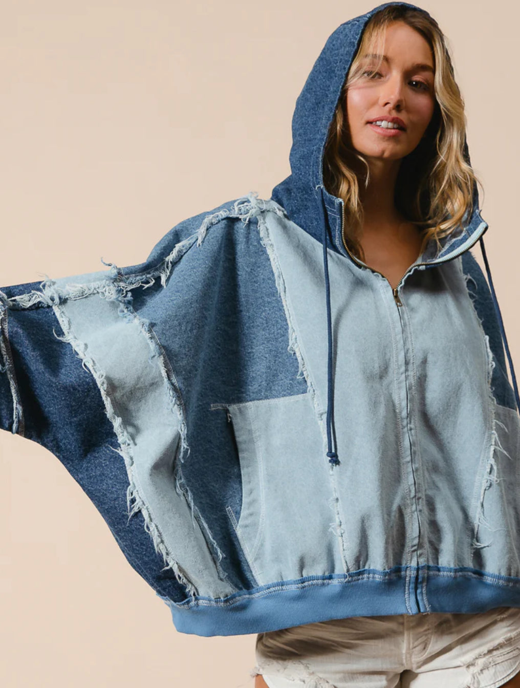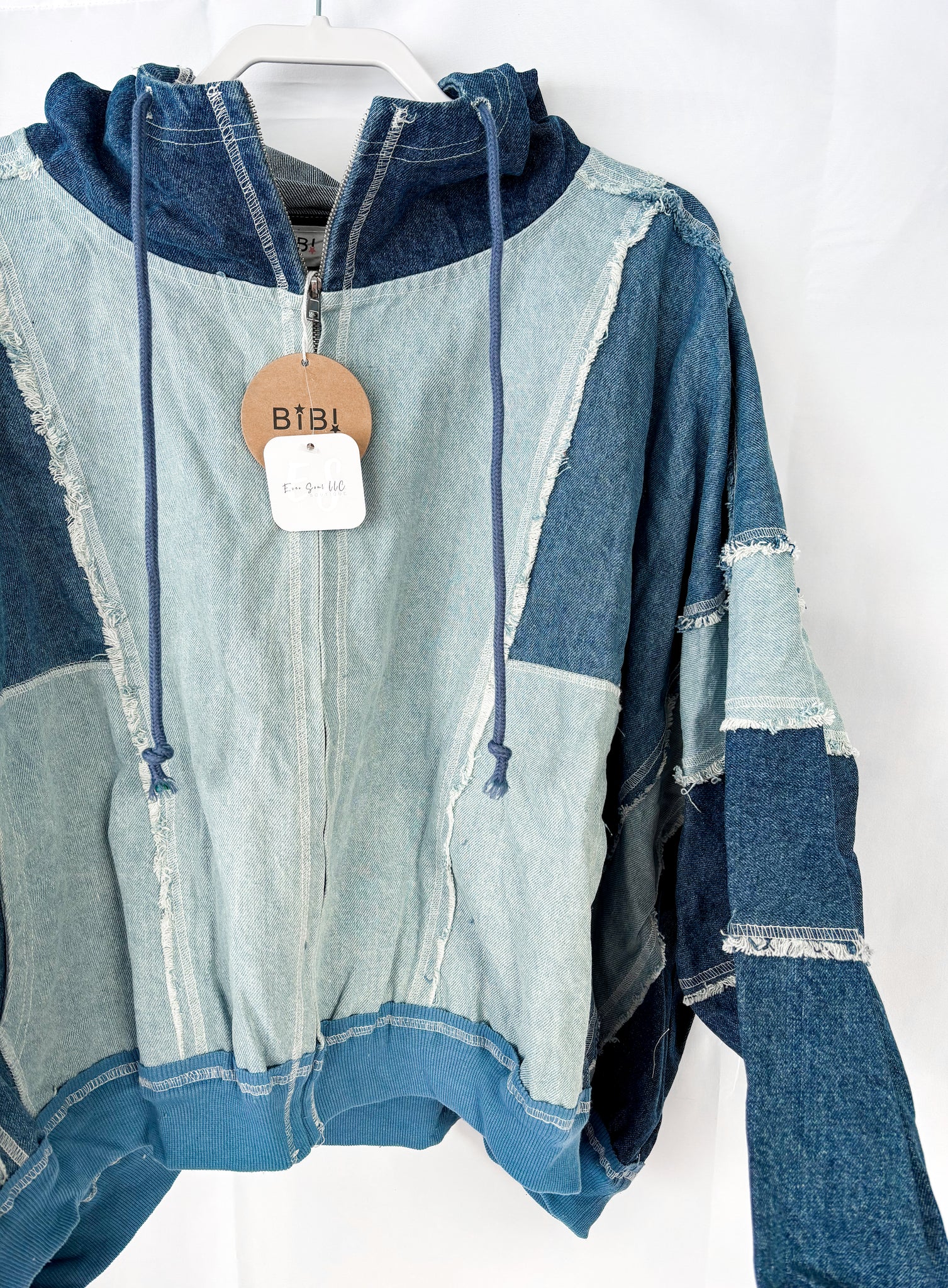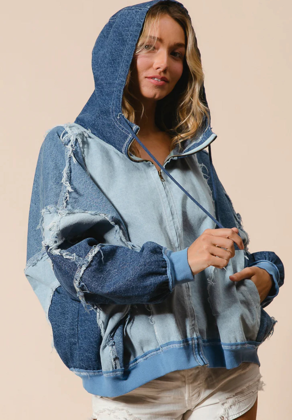 Color block washed denim zip up hoodie. BiBi is one of our favorite brands that never misses!