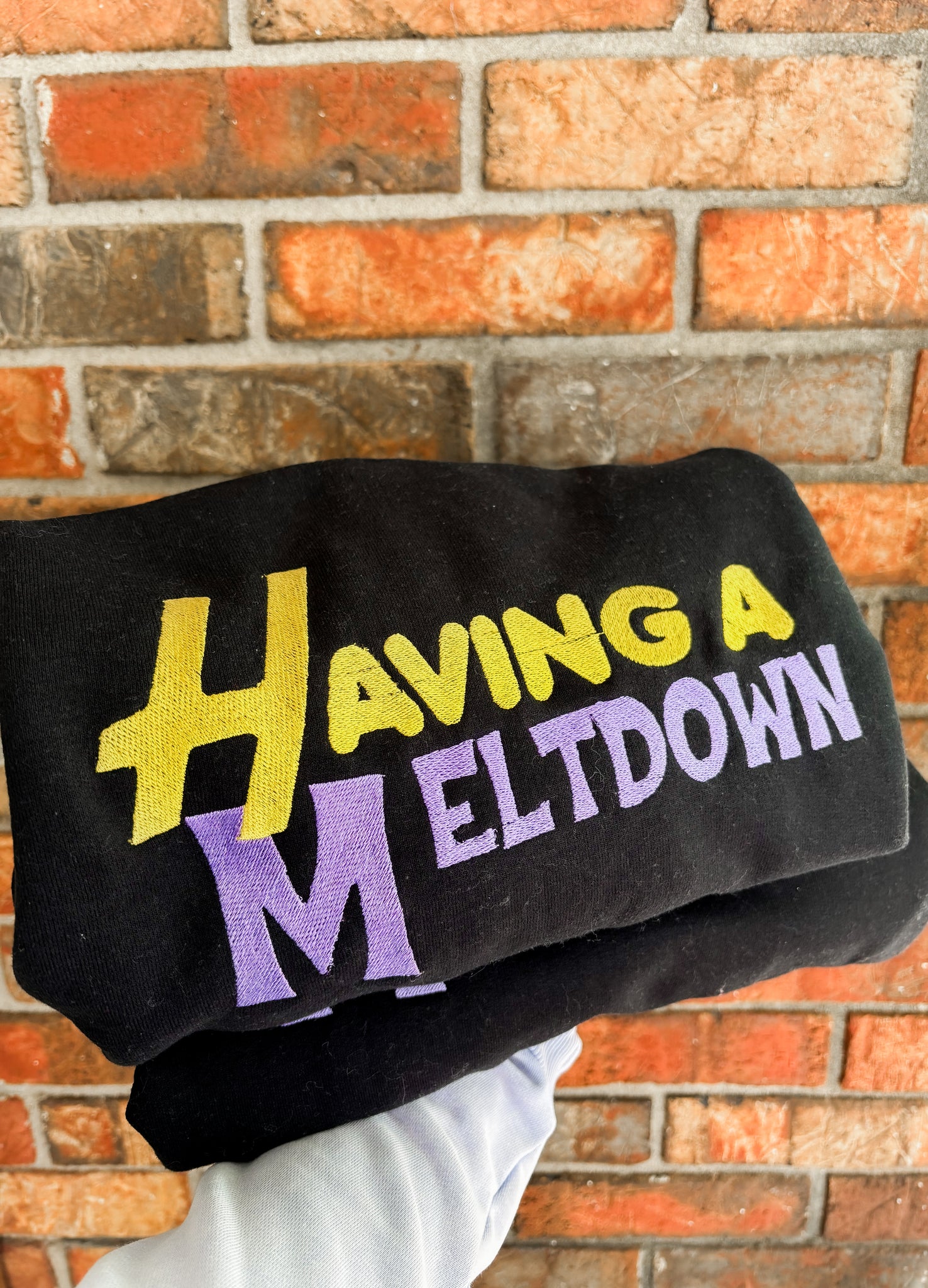 “Having A Meltdown” embroidered crewneck sweatshirt in black. Gildan unisex brand. All my fellow 90s babies will appreciate this one!