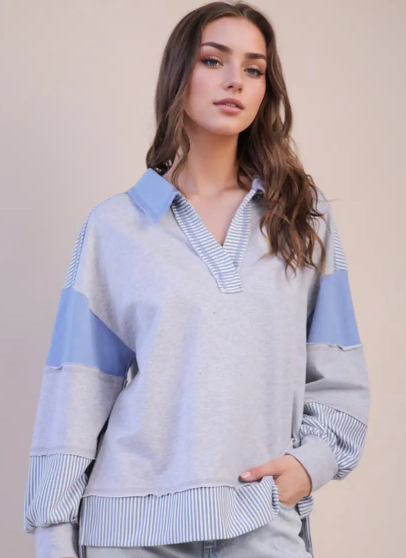 Color block solid and stripe knit top in heather gray and blue colors. Top features drop shoulder, collar, side slit, and hi-lo hem.