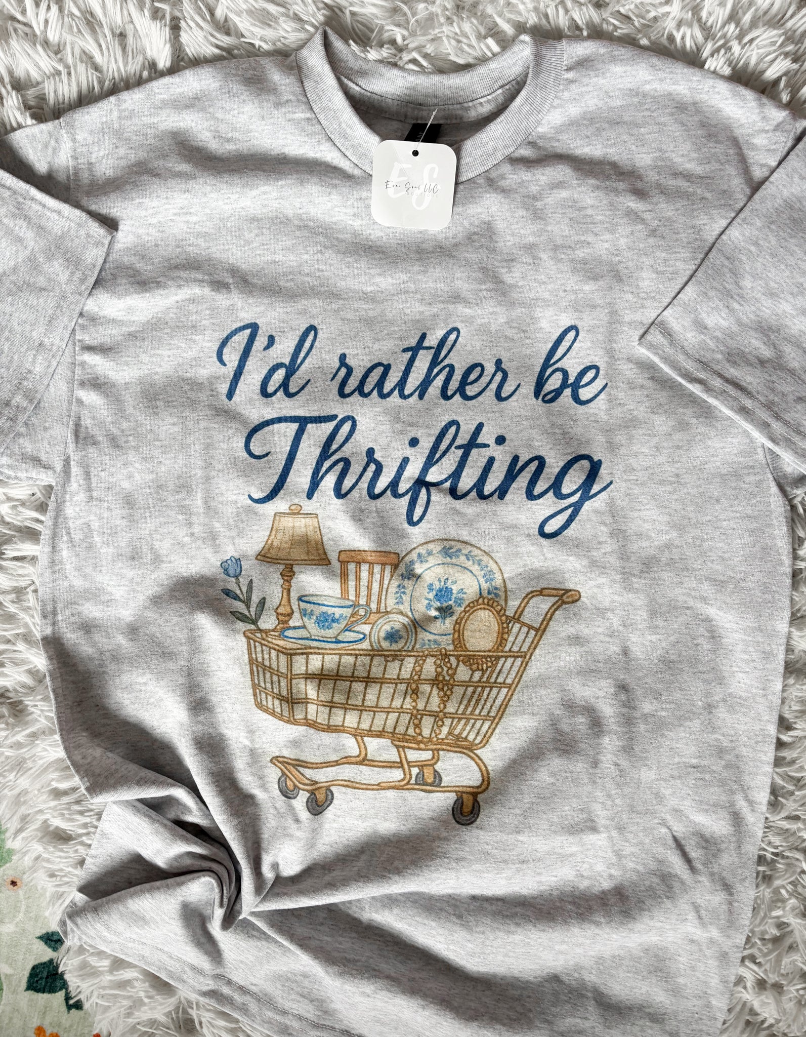 Printed on Gildan dryblend brand tshirt in ash grey color. Tee reads “I’d rather be thrifting!” 50% Cotton, 50% Polyester.