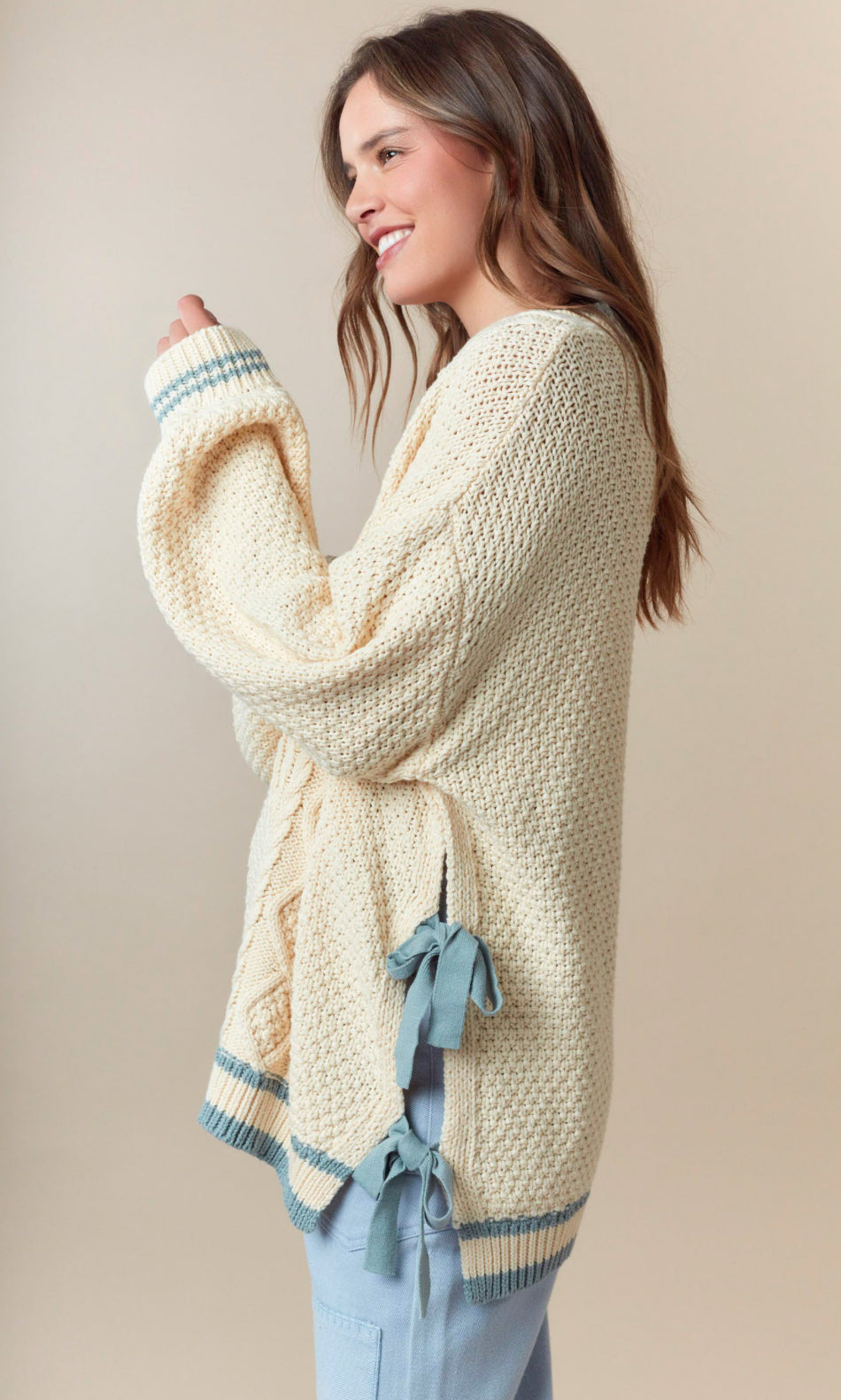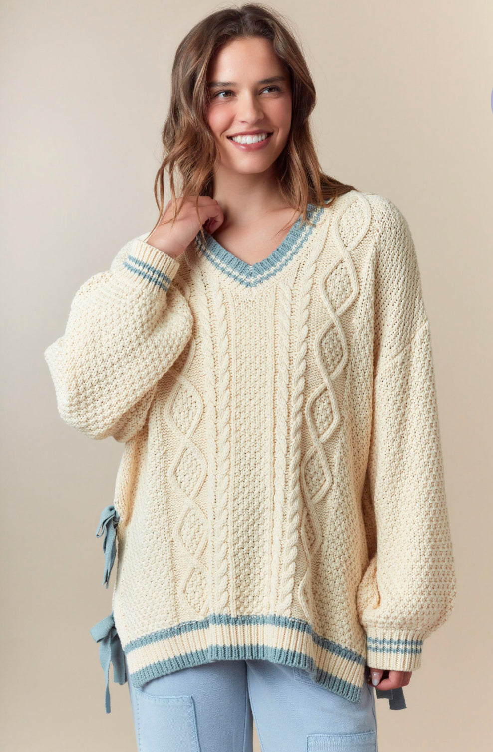 Gorgeous v-neck sport band side ribbon tie relaxed sweater in cream and sage colors. 60% Cotton, 40% Acrylic.