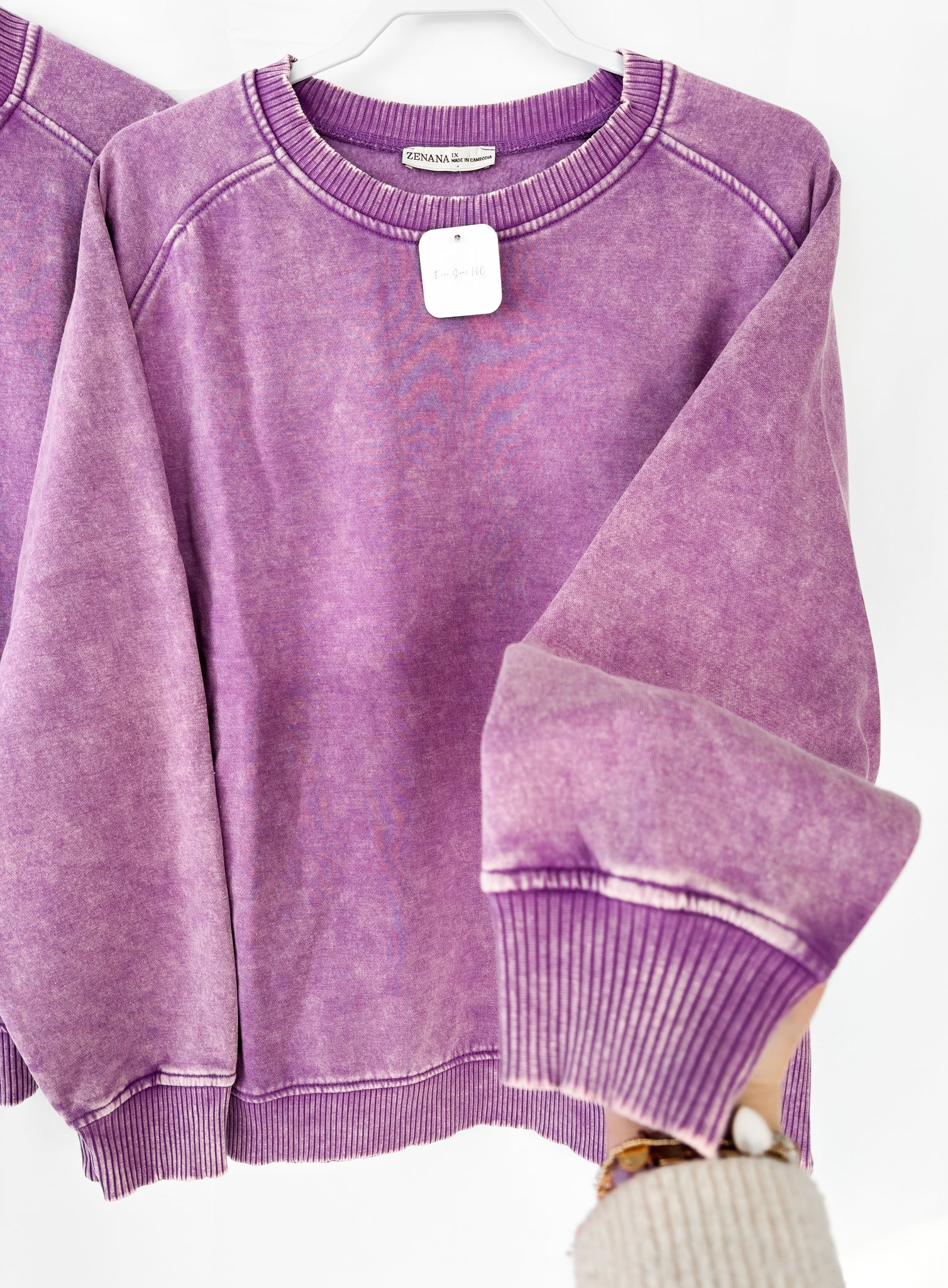 Acid washed fleece sweatshirt in blue violet color that features side ribbed detail. 60% Cotton, 40% Polyester.