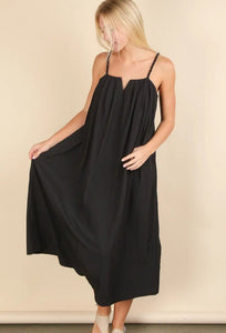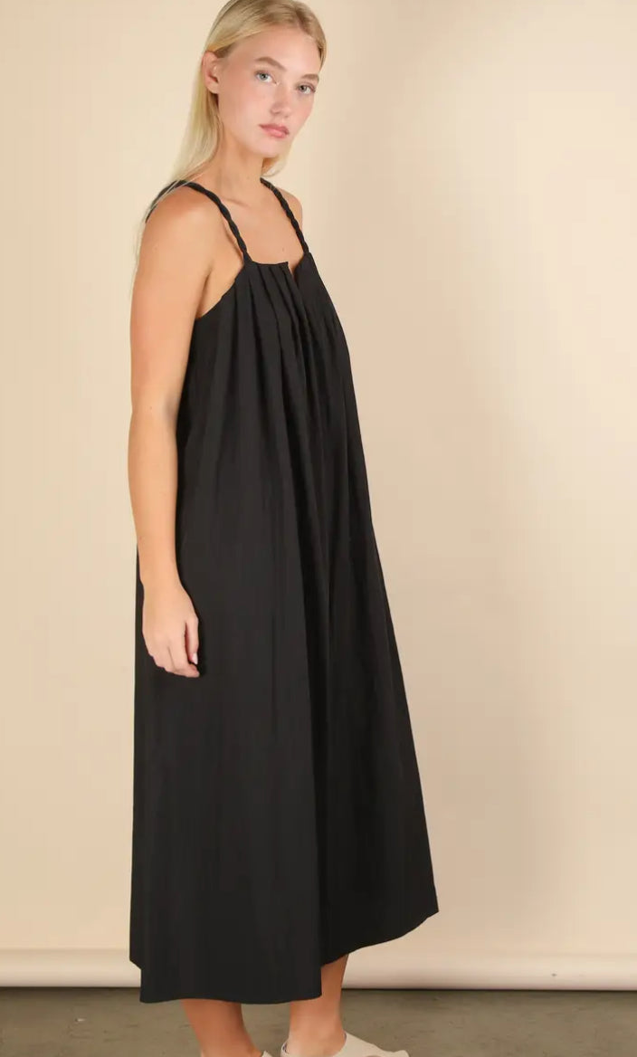 Pleated solid woven midi dress in black. Dress features pleated design, twisted rope shoulder string, sleeveless, split neck, and midi length.