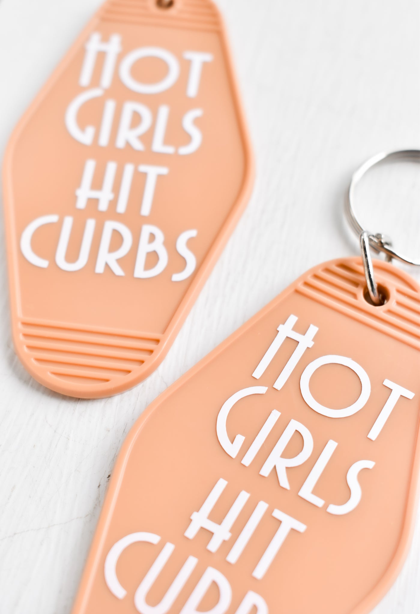 Adorable retro motel keychain in coffee color with pink and white iridescent-like font that reads “hot girls hit curbs.” Relatable and a fun gift! Made by SarahMackenzieStudio.