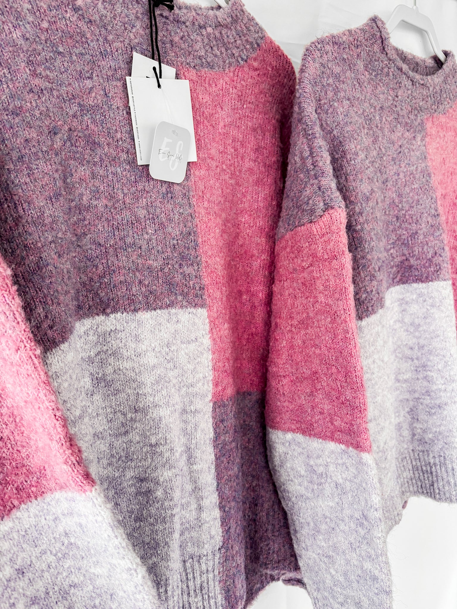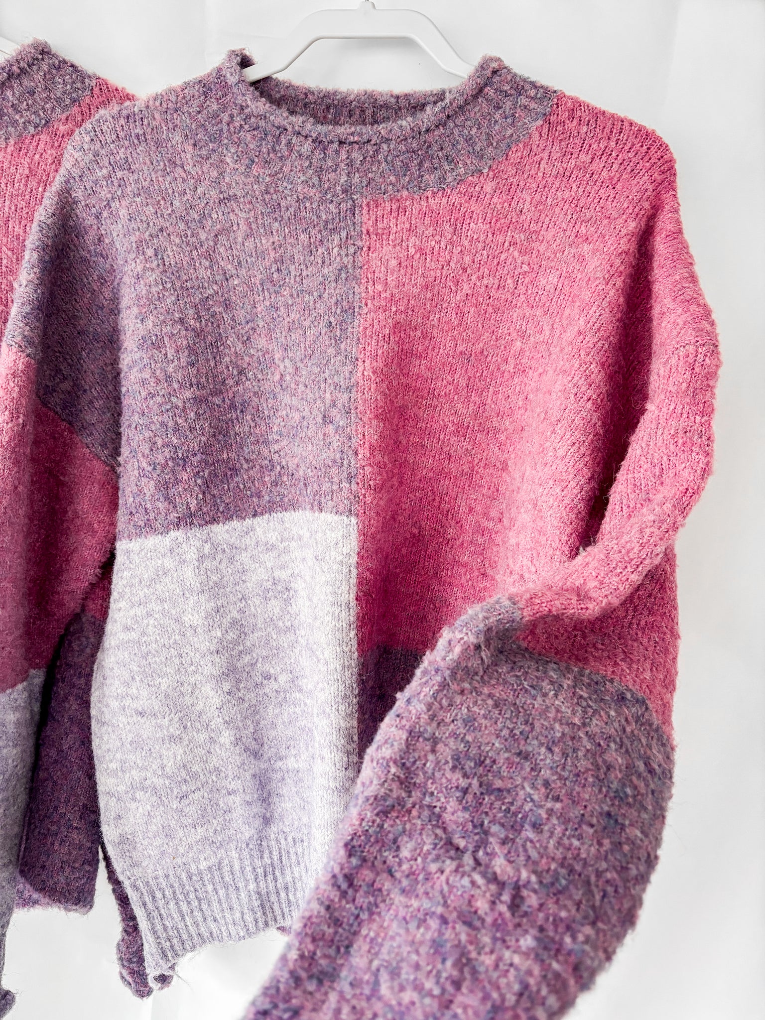 Color block cozy knit sweater that features a round neck, rolled sleeve edge and neck, drop shoulder, and ribbed hem. 70% Polyester, 15% Acrylic, 10% Wool, 5% Nylon.