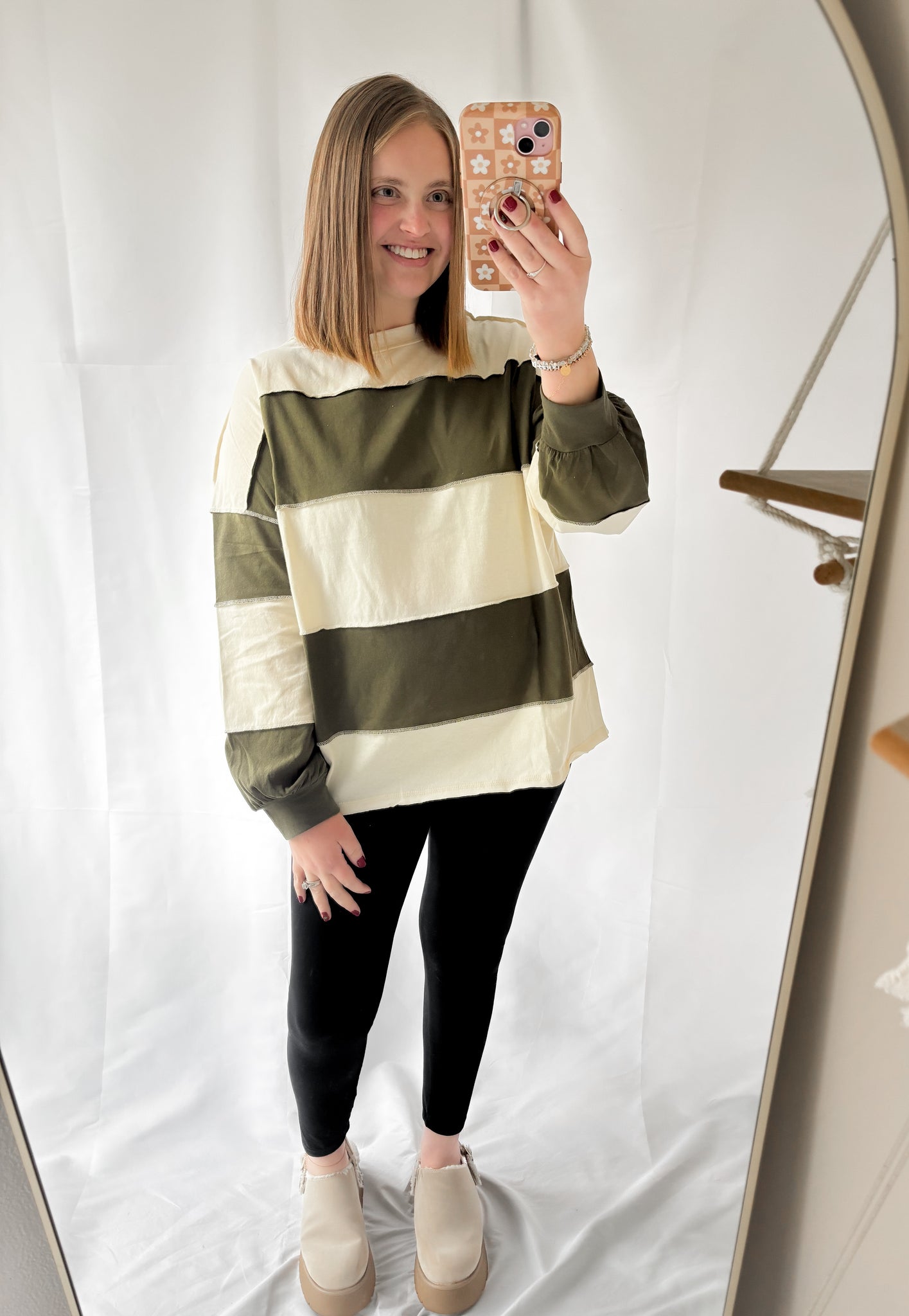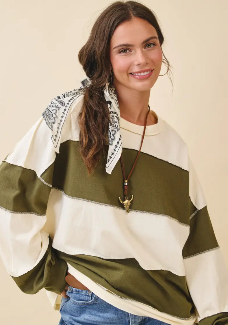 Contrast panel long sleeve slouchy top in olive and butter color combo. Top features bold paneling, soft seams, and a loose and boxy fit.