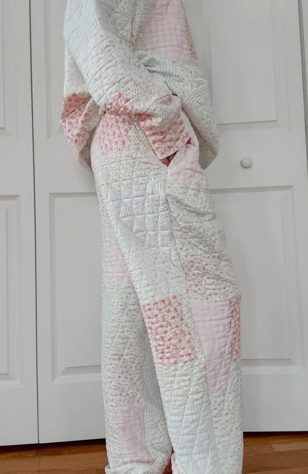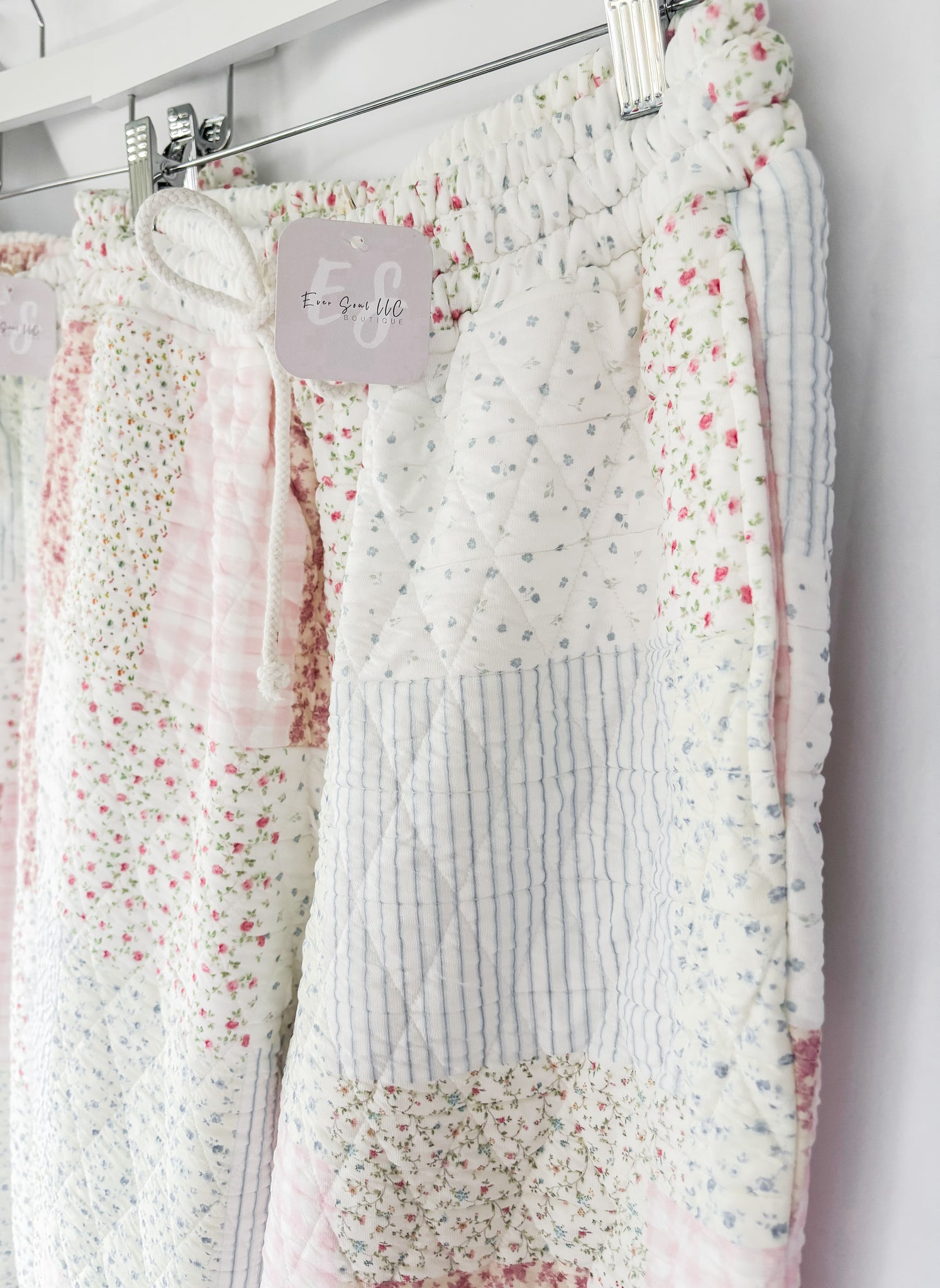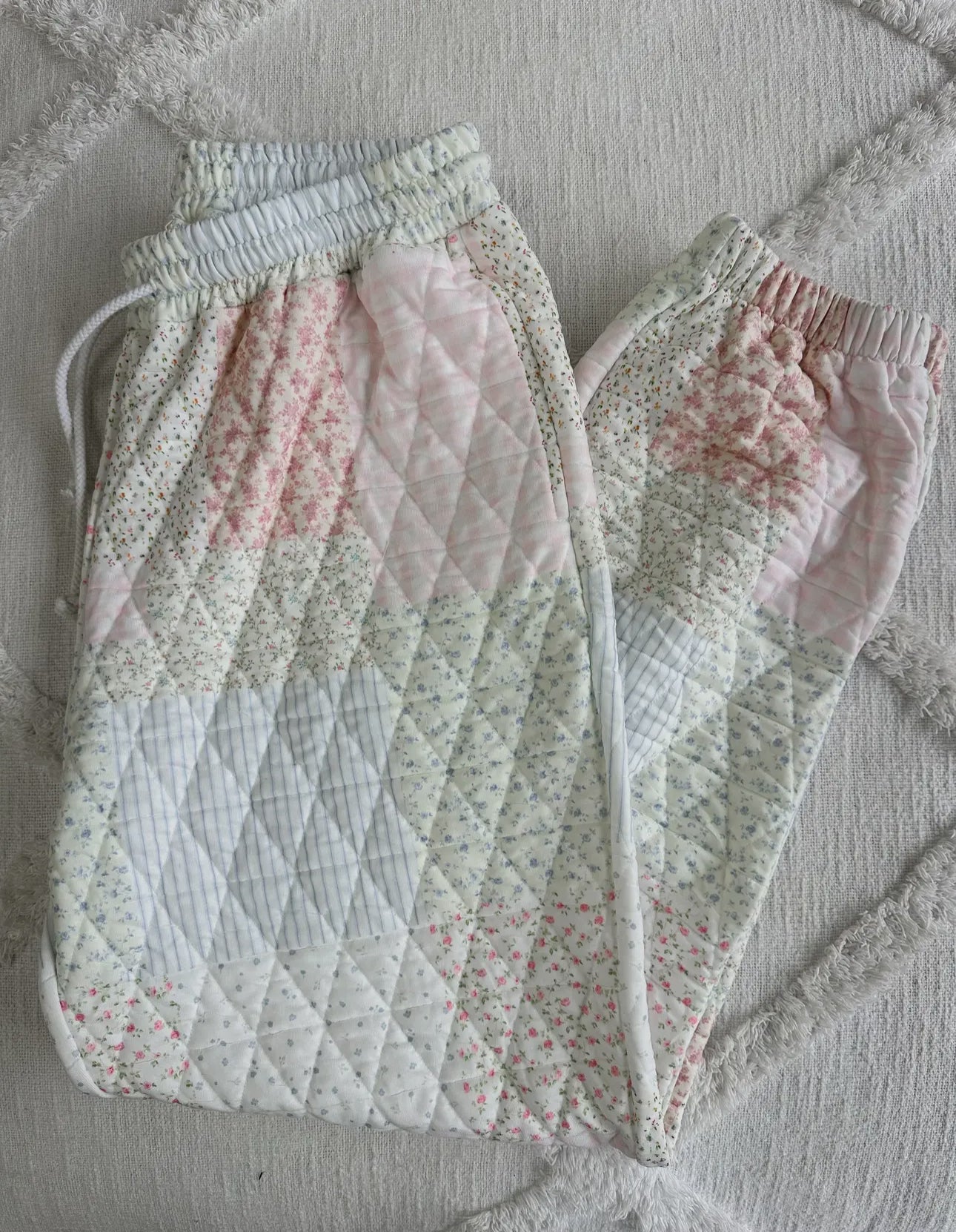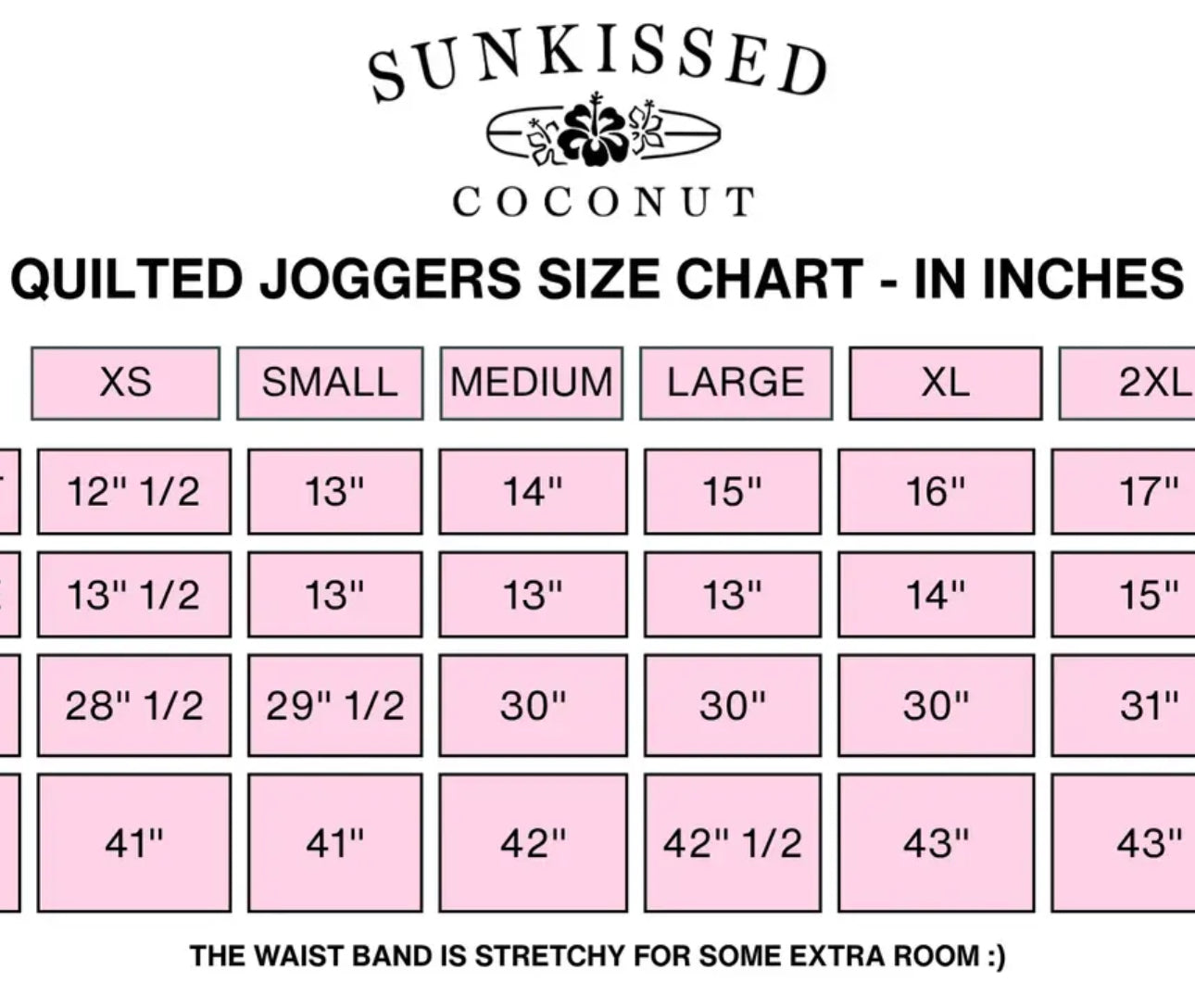 Gorgeous quilted pastel colored joggers by Sunkissed Coconut. Adult unisex sizing. Sizing chart in pictures! I am comfortable in the Medium as a size 10/12.