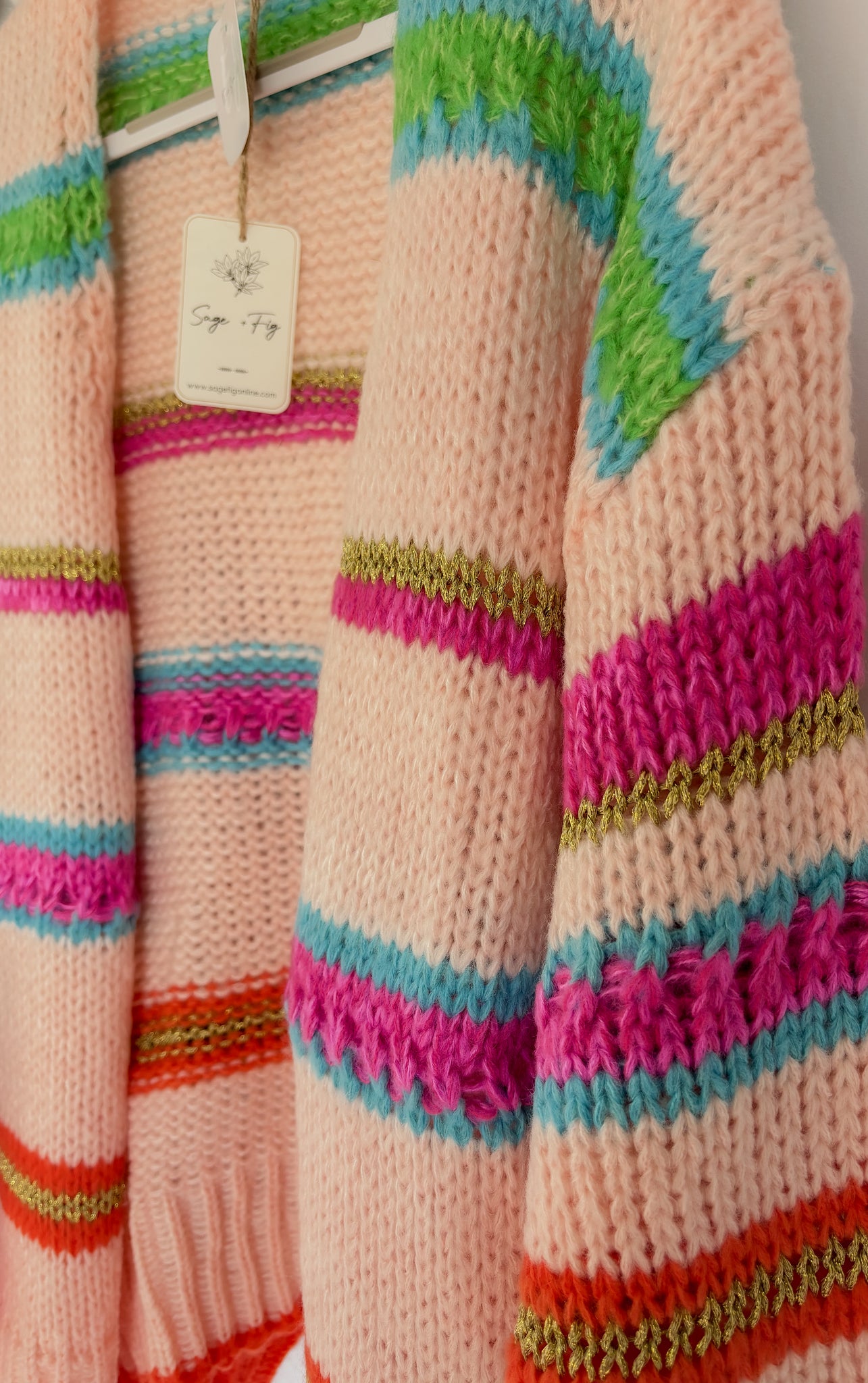 Multi color striped chunky knit cardigan that features open-front silhouette, chunky/cozy knit texture, ribbed cuffs and hem, and slouchy fit.